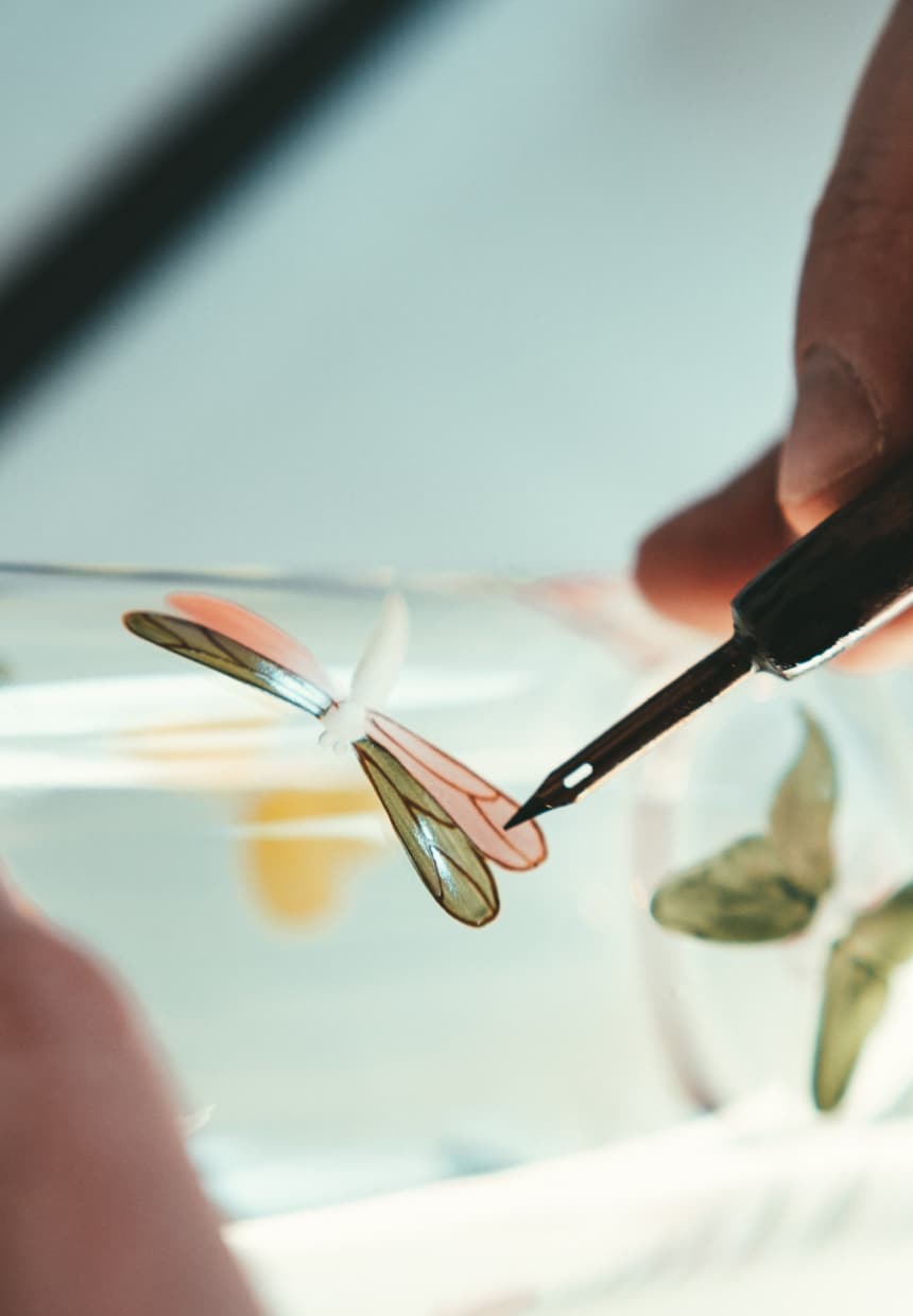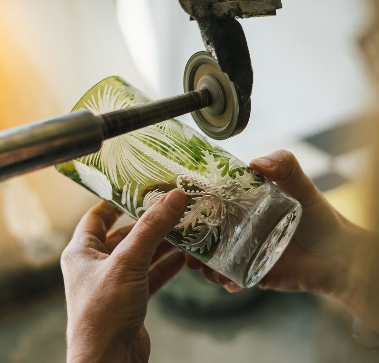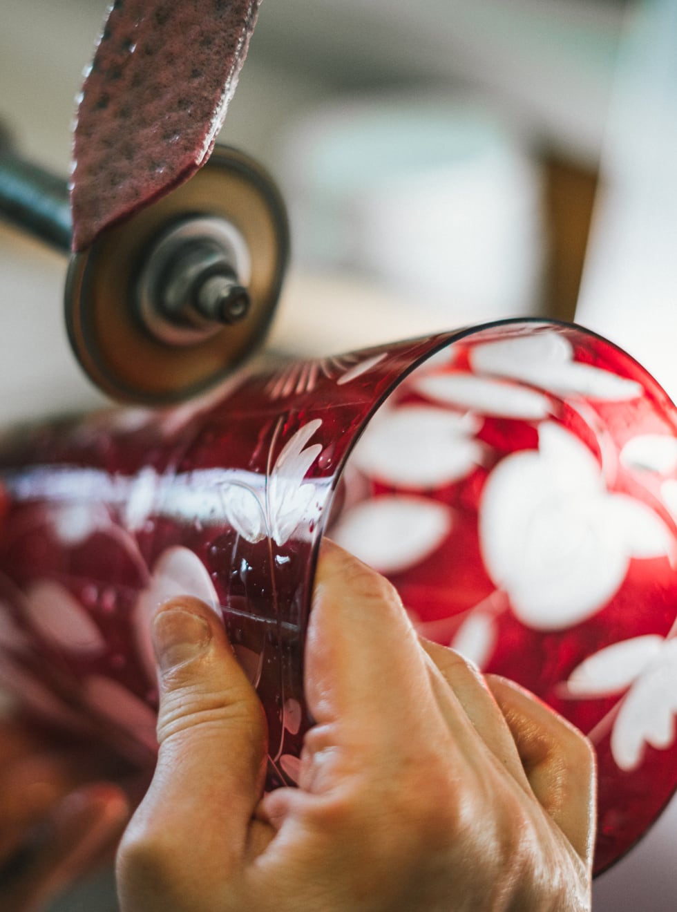 Each crystal glass and vase is painstakingly handcrafted by a team of highly skilled Czech artisans using only traditional production methods, such as glass blowing, cutting, painting, engraving, sandblasting and gilding. Decorative techniques are practised entirely by hand, with each artisan using mere markings to produce intricately detailed patterns and designs. Given the slight irregularities of mouth-blown crystal, motifs must be individually adjusted for every piece, meaning that no two pieces are ever exactly alike.