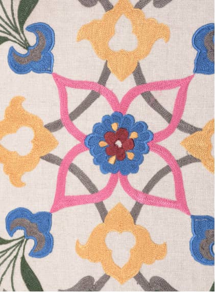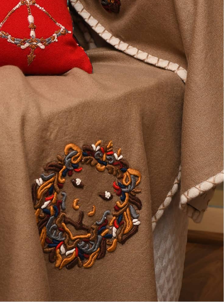 Indian craftsmanship is at the heart of the Janavi India brand. Its community of over 400 craftspeople are based in two state-of-the-art factories in Noida, India, and supported by units in Kashmir and Nepal. Jyotika Jhalani, known in the industry as the cashmere alchemist, carefully sources her luxury yarns and fibres from Ladakh, Mongolia, China and Nepal. Each Janavi India piece is treated as a work of art that tells its own unique story. Soft woven wool and cashmere serve as a canvas for designs featuring mythical beings, talismans, flora and fauna, which are hand and machine embroidered using a mood board or “paint box"" of 21 colours.