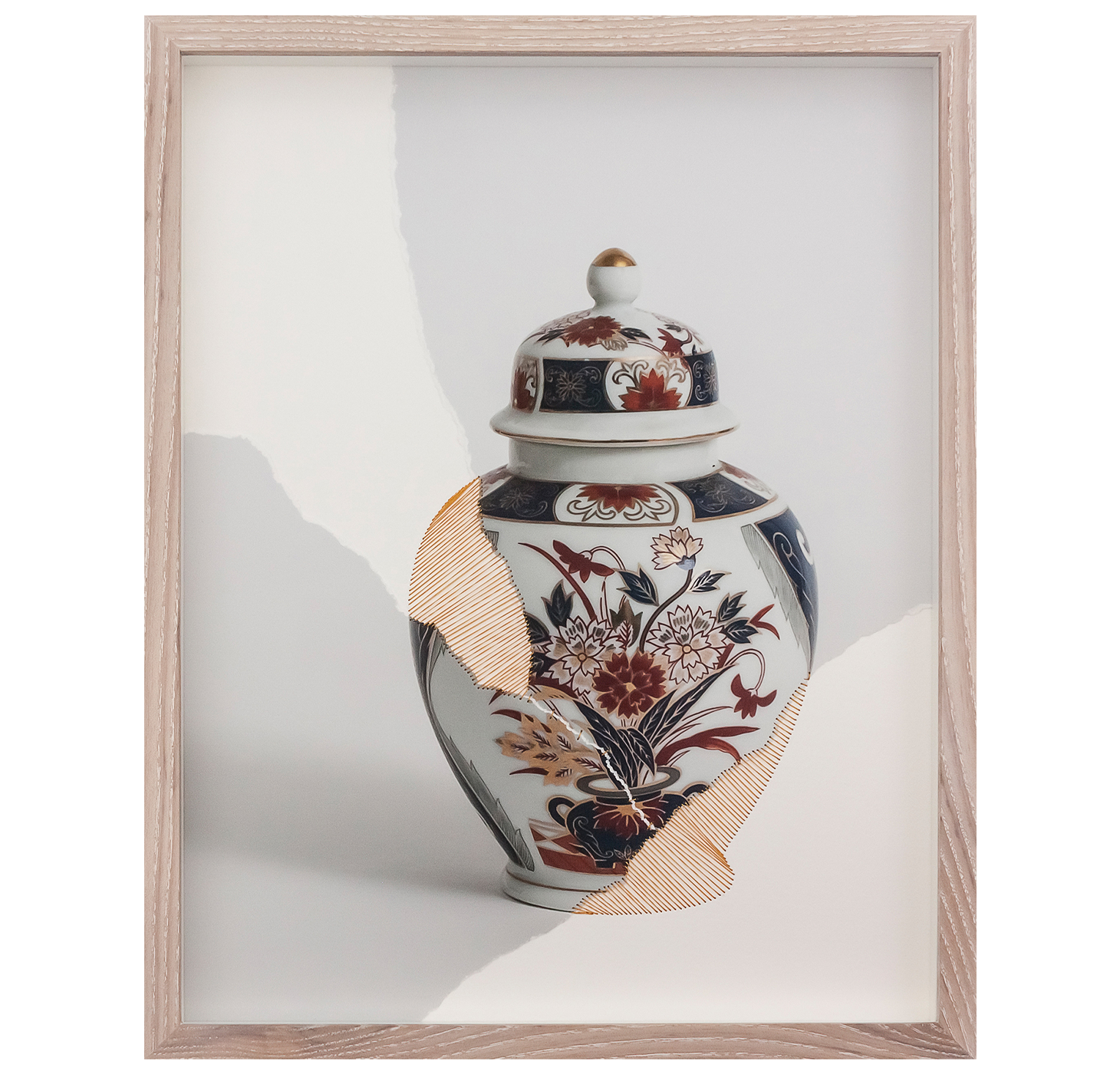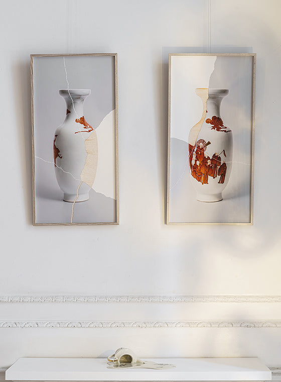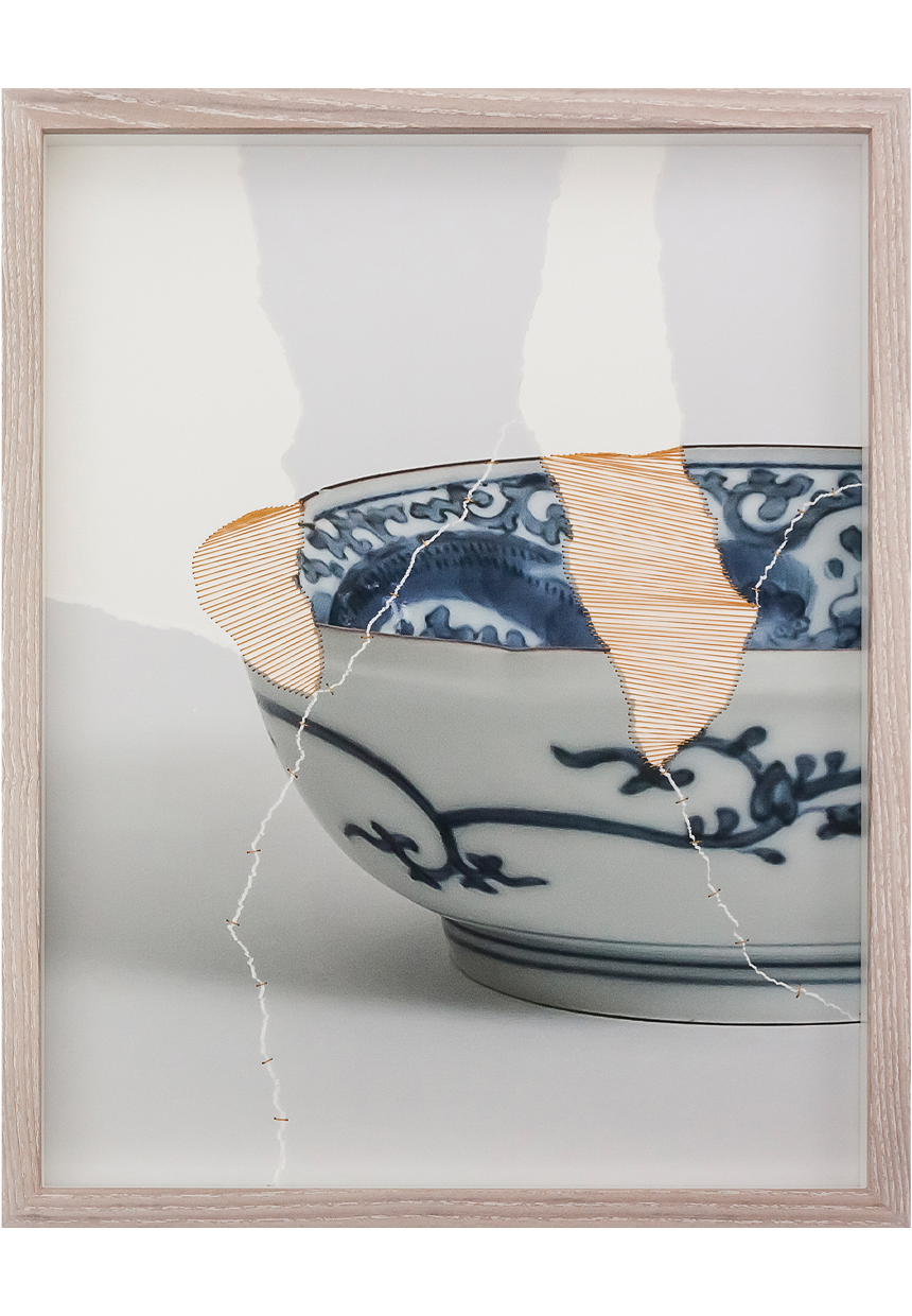 Livia's artworks examine how we relate to materials in an era dominated by standardisation and global distribution. Using mixed media, she celebrates the cultural and economic circulation of materials, skills and global power relations. Central to her work is the idea of estrangement, including loss and care, which operate to reverse the excess of familiarity. Honouring the Japanese art of kintsugi, traces of time and human intervention characterise each giclée image, marking the process of repair and rebirth.