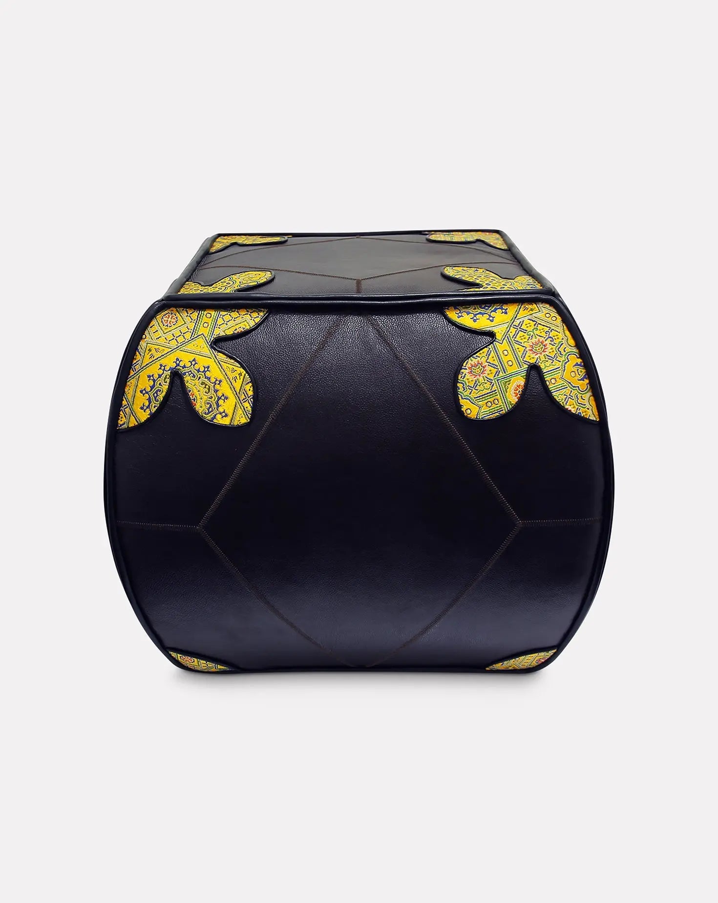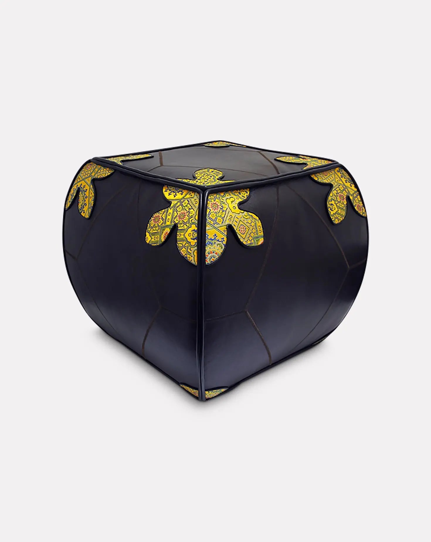 Cow Leather Yellow Chinese Silk Brocade Pouffe