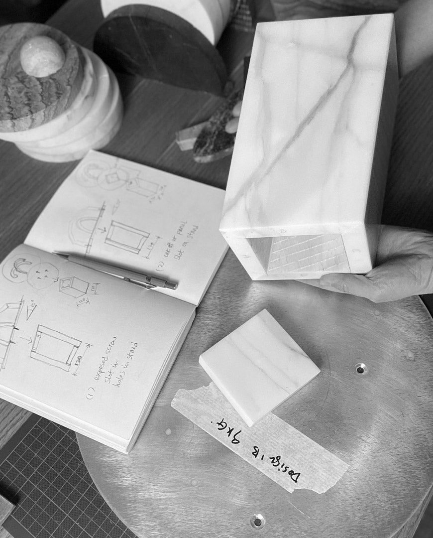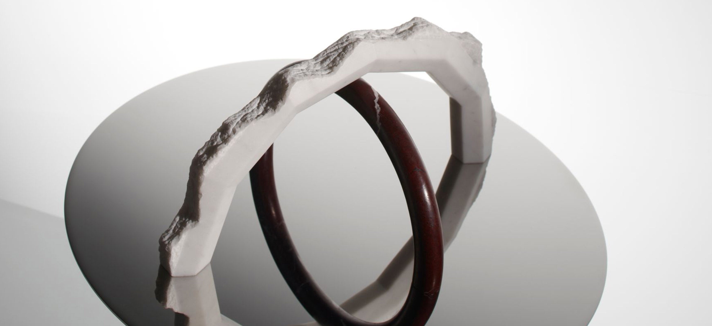 In May 2023, Hongdi debuted her inaugural collection, 'Keep Moving,' at ARTEFACT, the Contemporary Craft Fair during London Craft Week. Her creations are inspired by repurposing marble cut-offs and employing innovative metalwork, harnessing constant motion and changing light. For each design, geometric shapes are strategically laid out to capture the marble's natural vein and flux. The collection showcases nonconformist shapes, reminiscent of planetary colours and textures, resulting in a dynamic and unique polychrome range that harmoniously merges traditional stone craft with modern techniques.