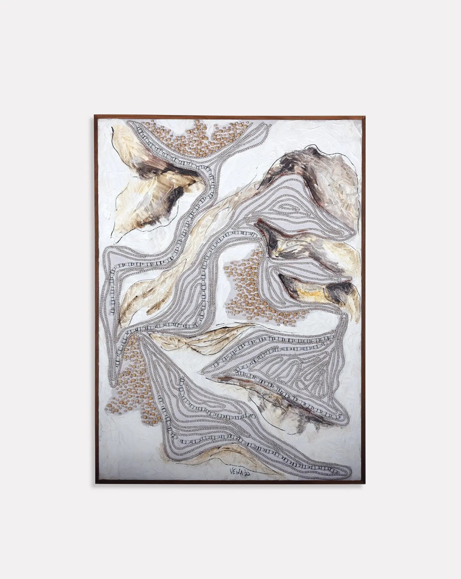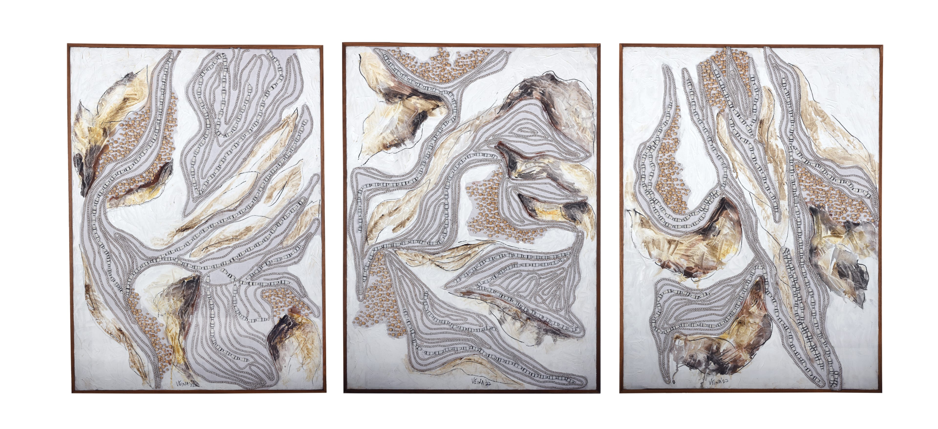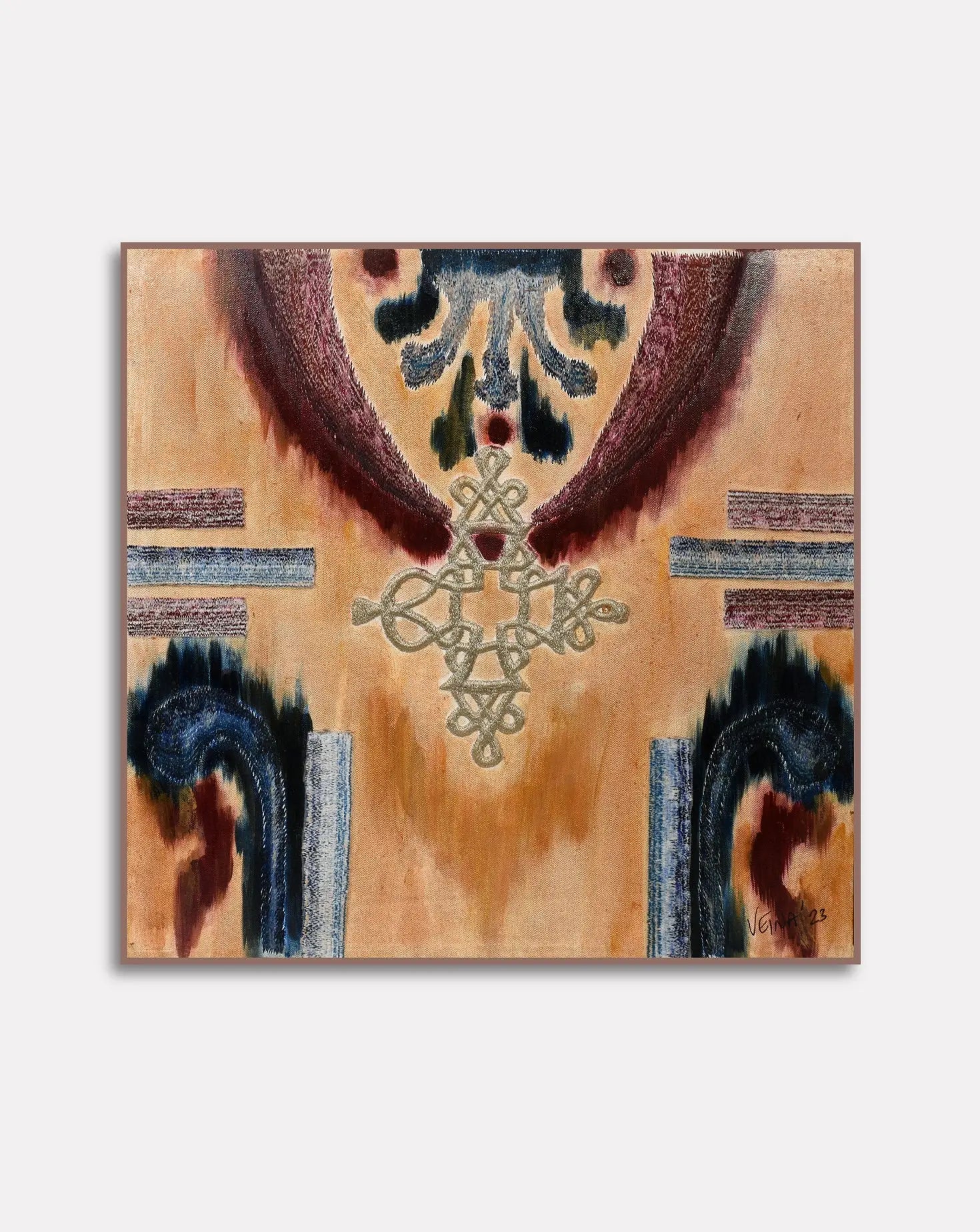 Each painting weaves together Veena’s passion for classical art and artisan techniques, breathing new life into raw metallic beading materials and embroidery. The artworks depict trees, birds or abstract forms influenced by nature and her experiences in the fashion world. Veena focuses on creating a modern response to traditional craft practice. Through process and materials, she tells timeless stories, via needle and thread, bead and brush.