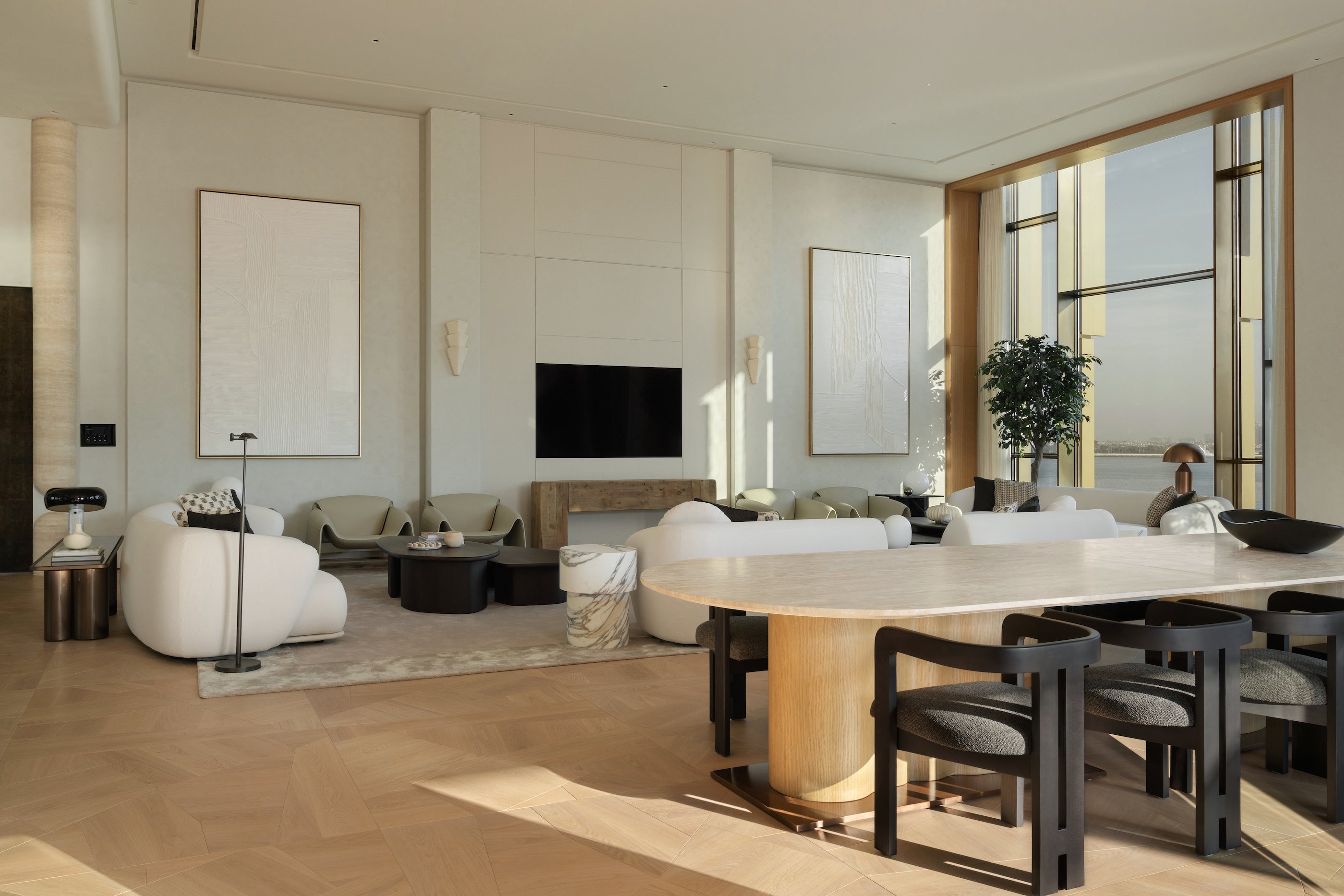 The five-bedroom Delano Penthouse, occupying the entire seventh floor of the hotel, offers an unrivaled living experience in Dubai, merging exquisite residential luxury with the exceptional style of ultra-luxury resort living.