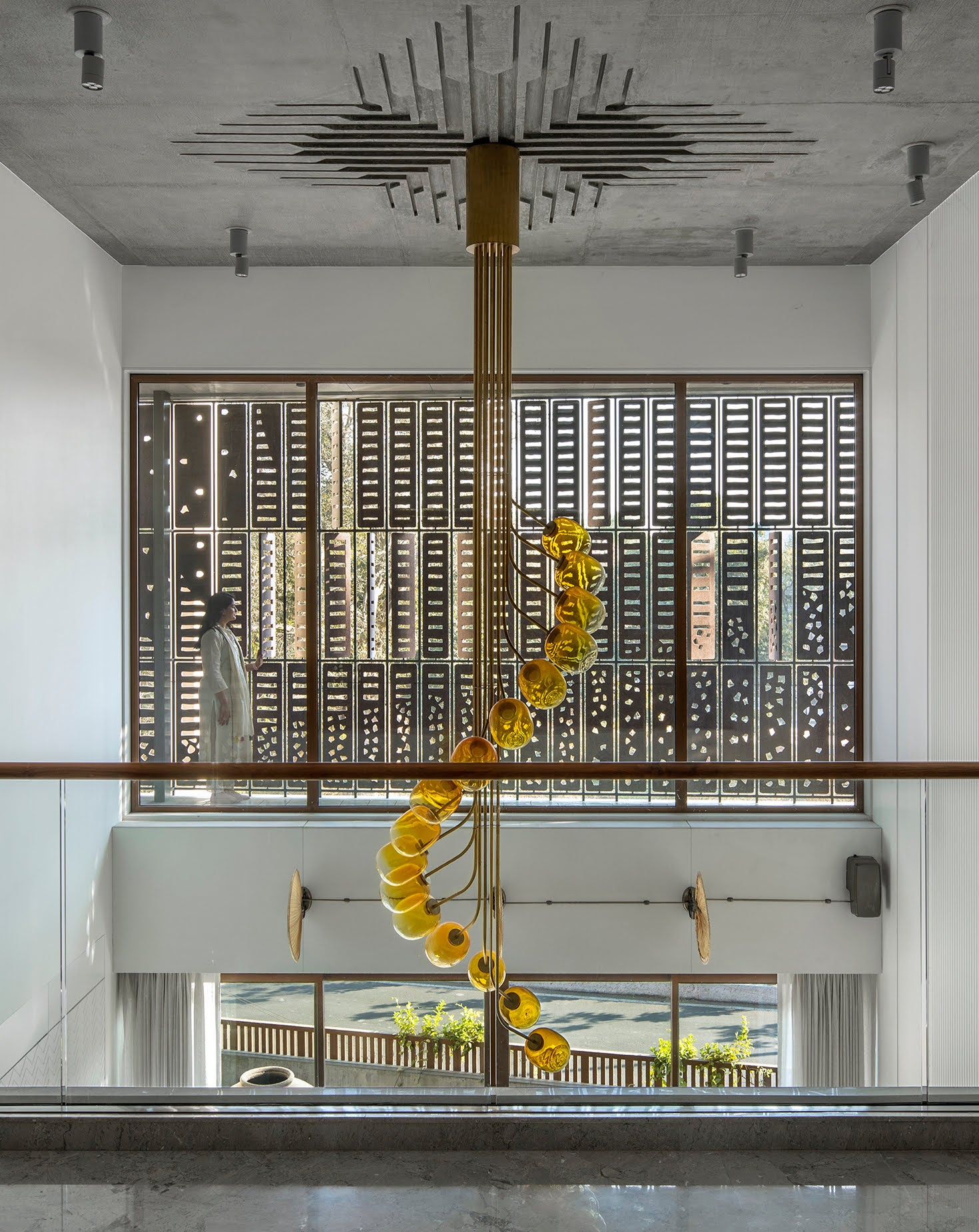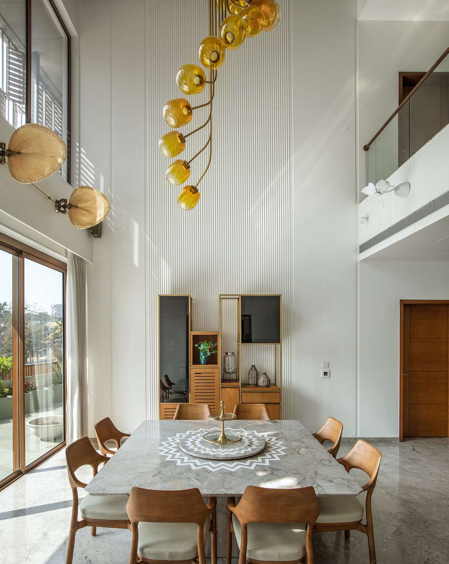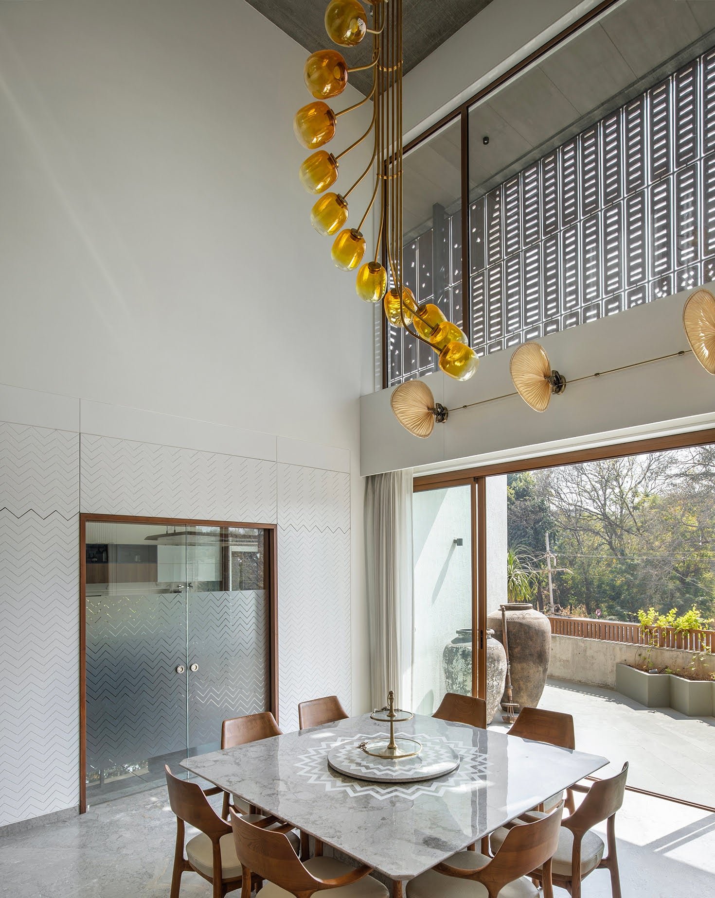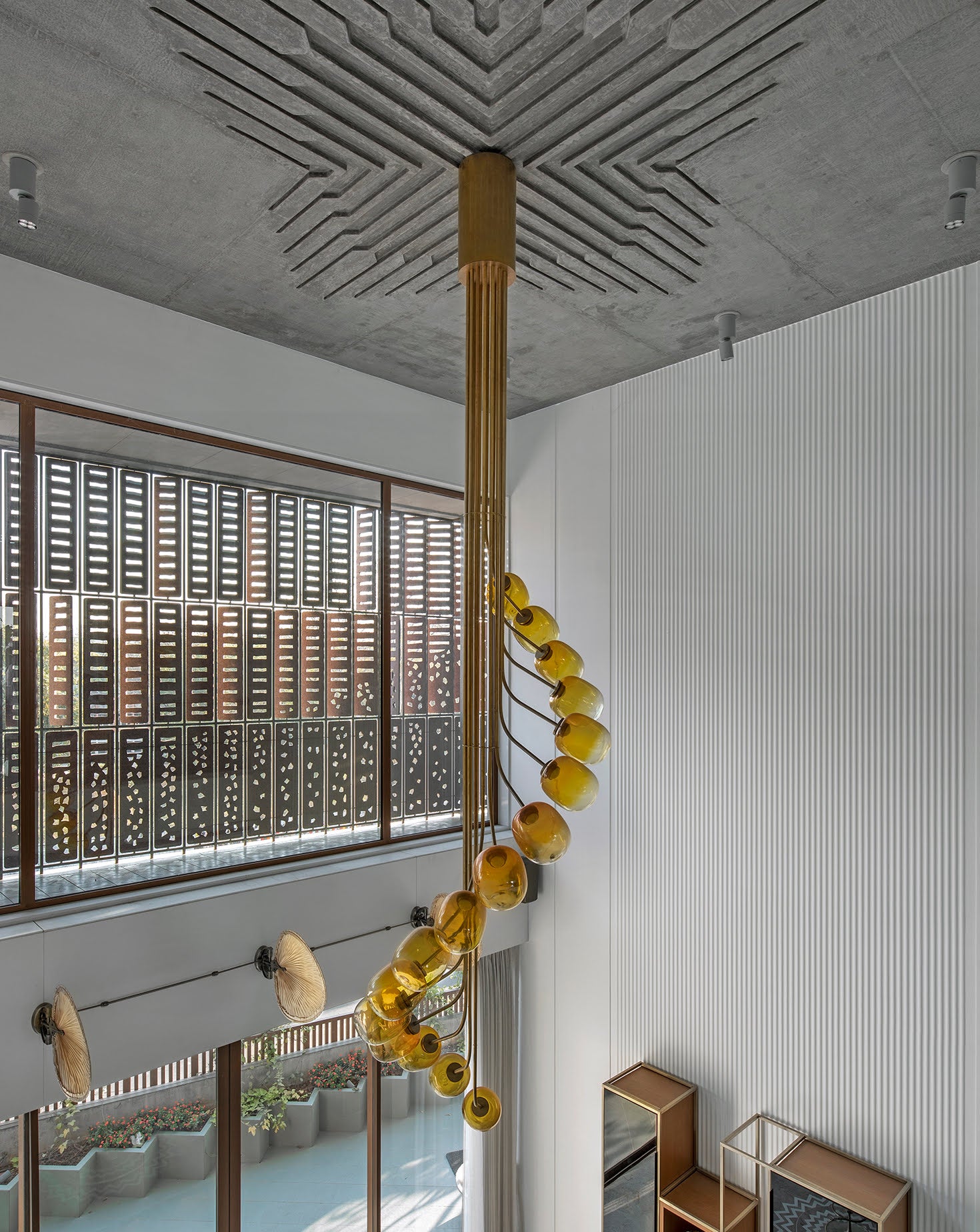 Supported by a sleek brass frame, this chandelier’s sculptural design makes it a striking centerpiece for contemporary interiors.