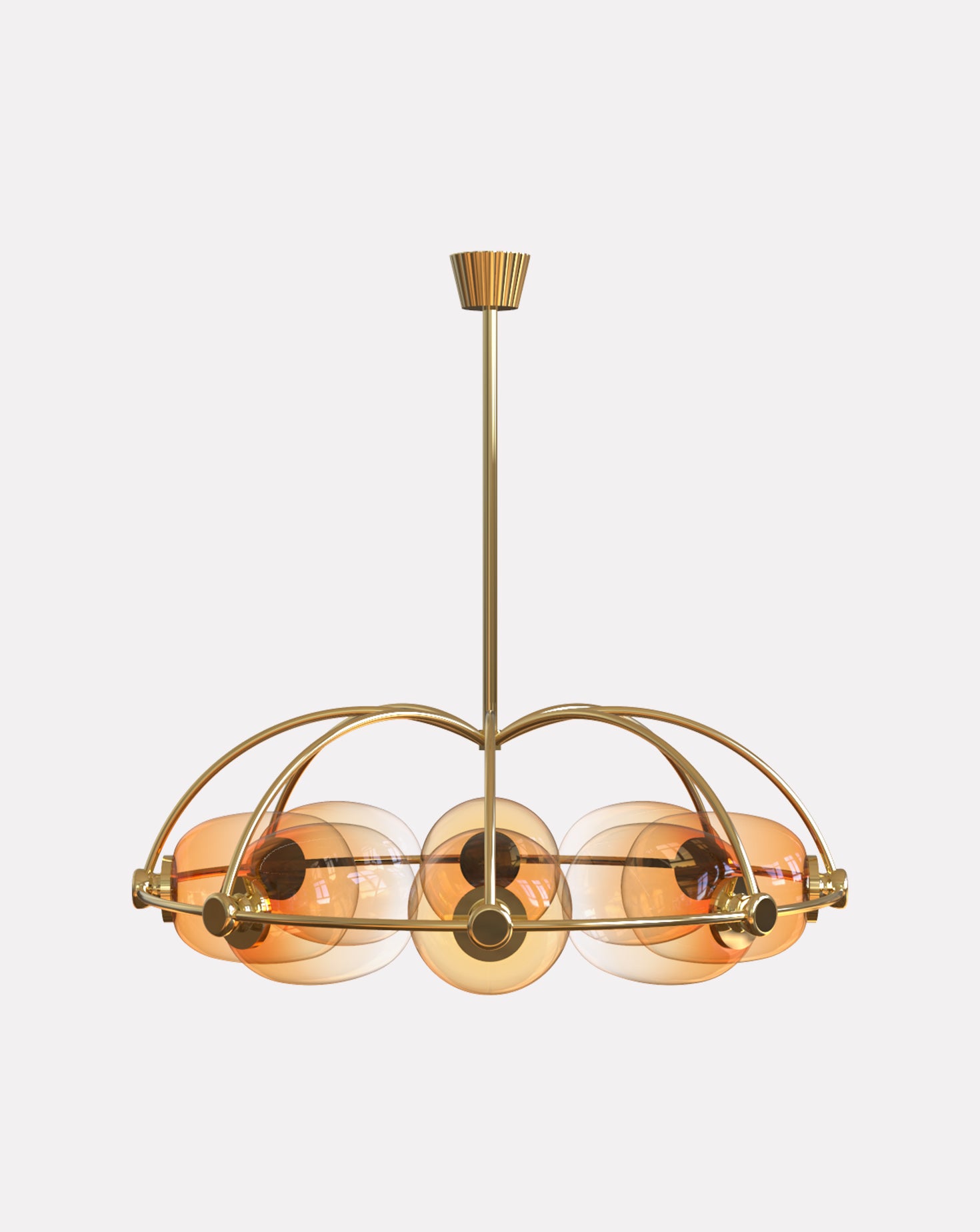 The 6 Module Paan Pasand Umbrella Candy Chandelier is inspired by the iconic Indian orange candy, featuring six hand-blown glass modules crafted by skilled Indian artisans with a striking green and red ombre finish that creates a warm, playful glow.