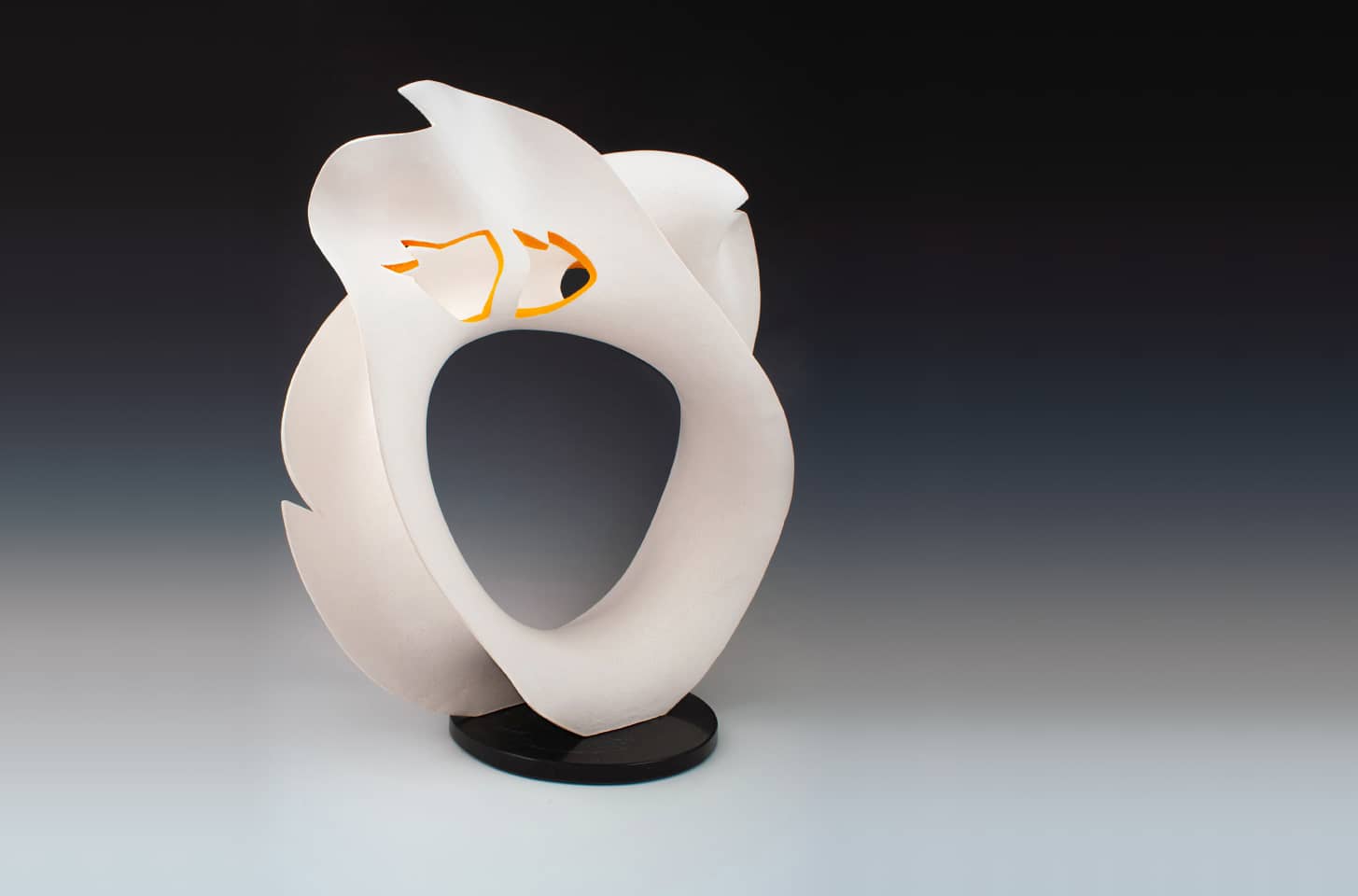 Crafted with skillful precision by UK-based ceramist Matt Sherratt on the potter's wheel, Ariel is a ceramic sculpture that showcases his mastery of traditional pottery techniques. Its organic curves and contours are enhanced by the interplay of white and bright orange hues on its intricate cut-out shapes. The piece invites viewers to explore its layers and gain a fresh perspective from every angle.