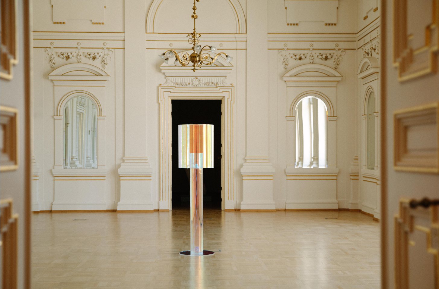Assembled from four solid brass tubes and a semi-spherical shade, the Art Deco-inspired floor lamp is specially treated with a unique patina that gets better with age. The contrasting travertine base is sourced from Italy and hand-formed into a curvaceous design that nods to the geometrical forms, synonymous with the Art Deco period.