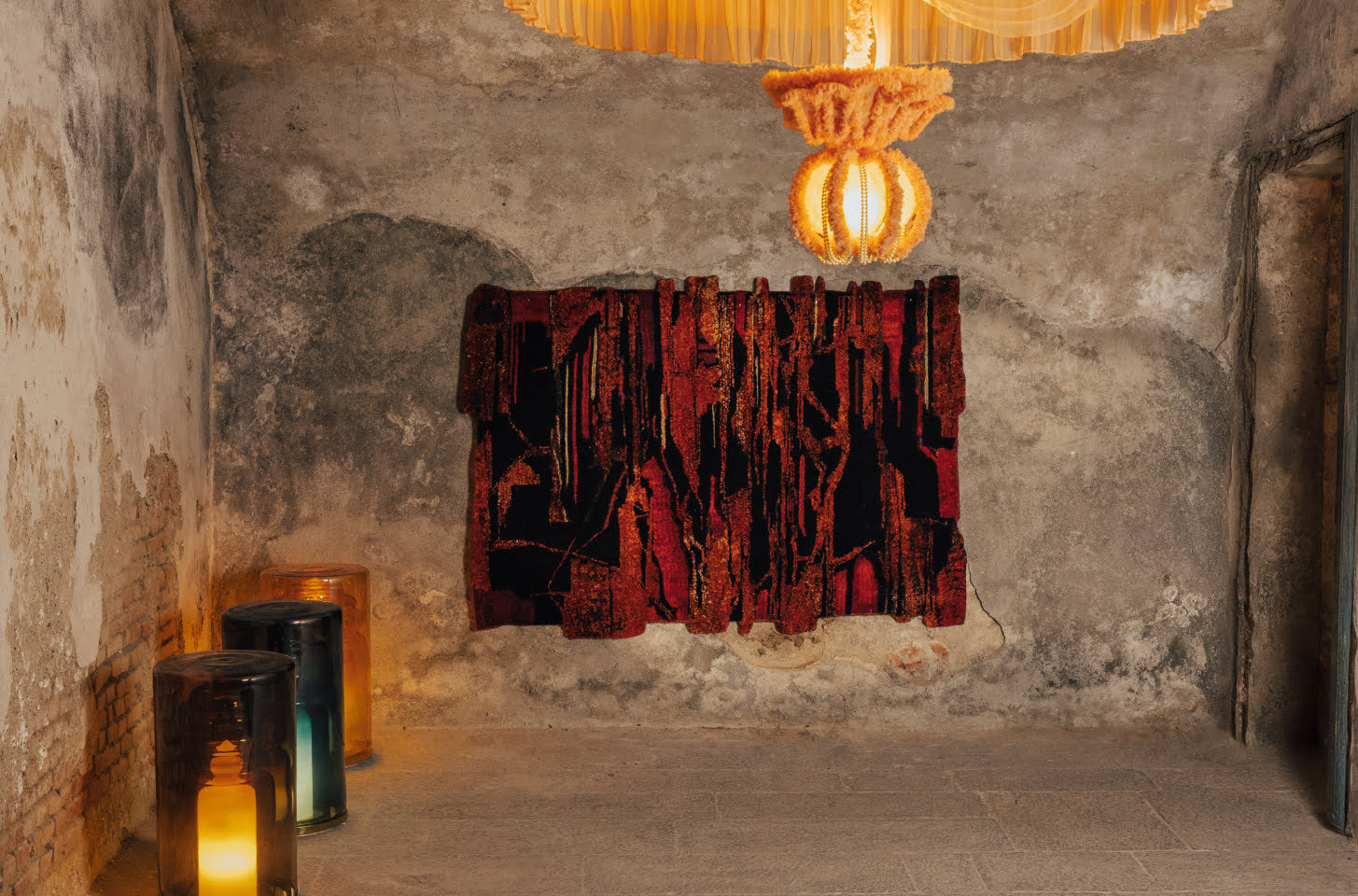 Metal elements created with a local jeweller introduce gold and silver-plated accents, adding a soft sheen and contrasting the rug’s tactile surface with precise, sculptural details.