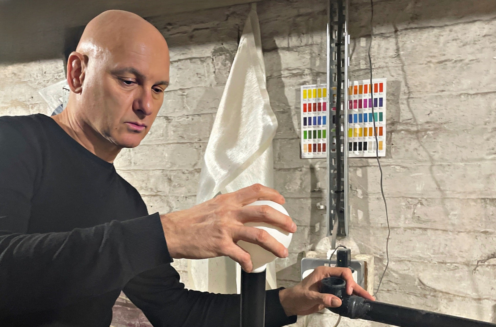 Nicola uses found objects and industrial building materials to make his sculptural and intriguingly textured lighting collections. His playful pieces often resemble organic forms – in the case of Bloom, a branch with a spring bud.