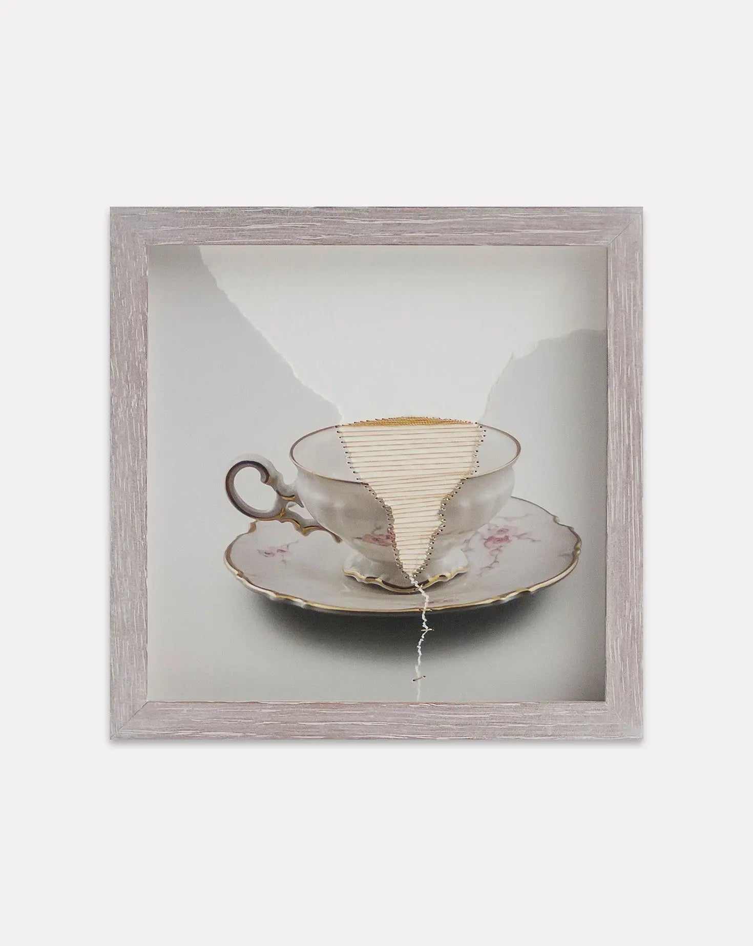 Livia Marin's mixed-media artwork uses Giclée printing on cotton paper, where fragments of photographs are meticulously reconnected through delicate gold thread stitching.