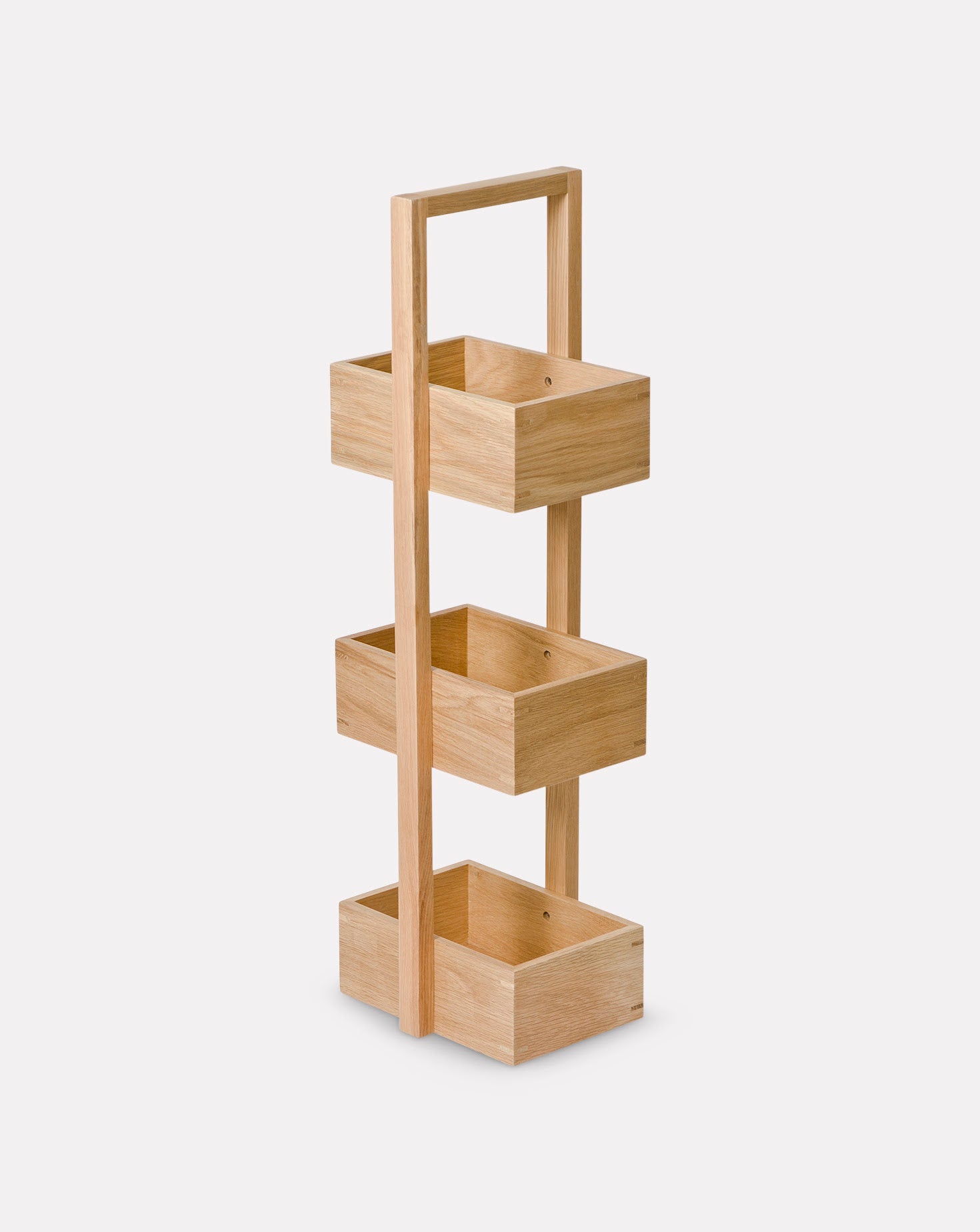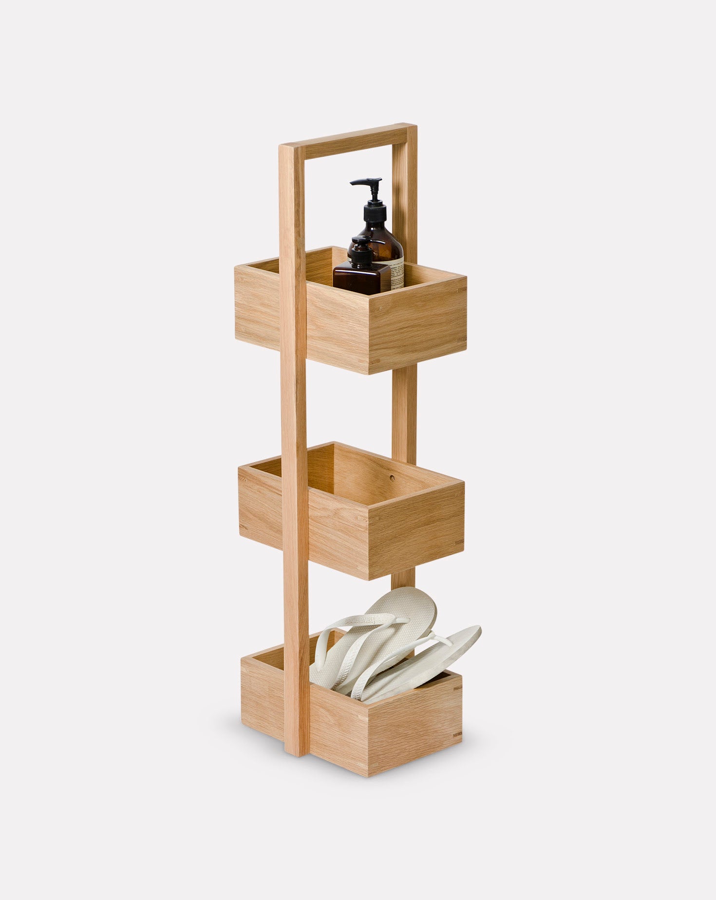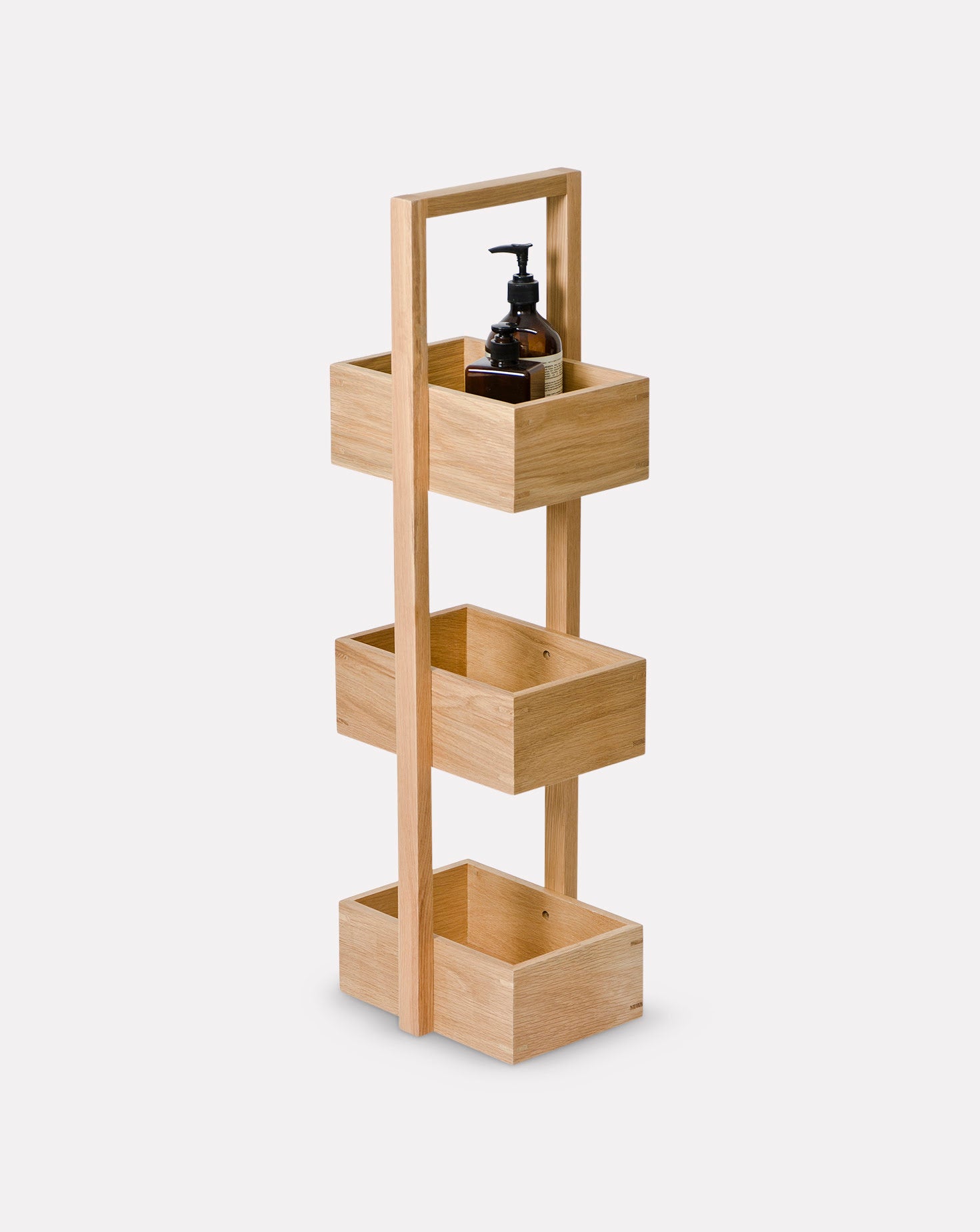 The Caddy Mezza offers a functional bathroom storage solution, designed with three deep trays to organize toiletries, lotions, or brushes while keeping them easily accessible. Its convenient handle, slim profile, and portable design allow it to fit seamlessly into underutilized spaces around the bath, shower, or sink.