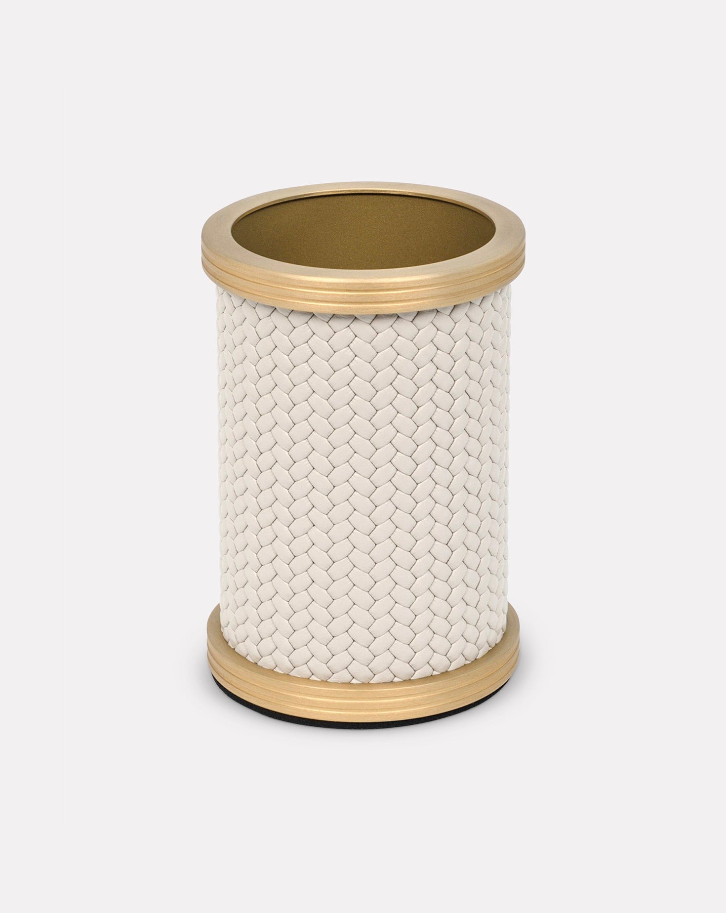 Carol Satin Brass Bathroom Set elevates everyday rituals with refined design - featuring a toothbrush holder, soap dispenser, and cotton pad container, all wrapped in waved waterproof leather and finished in satin brass. Both functional and decorative, it brings understated luxury to bathroom spaces.