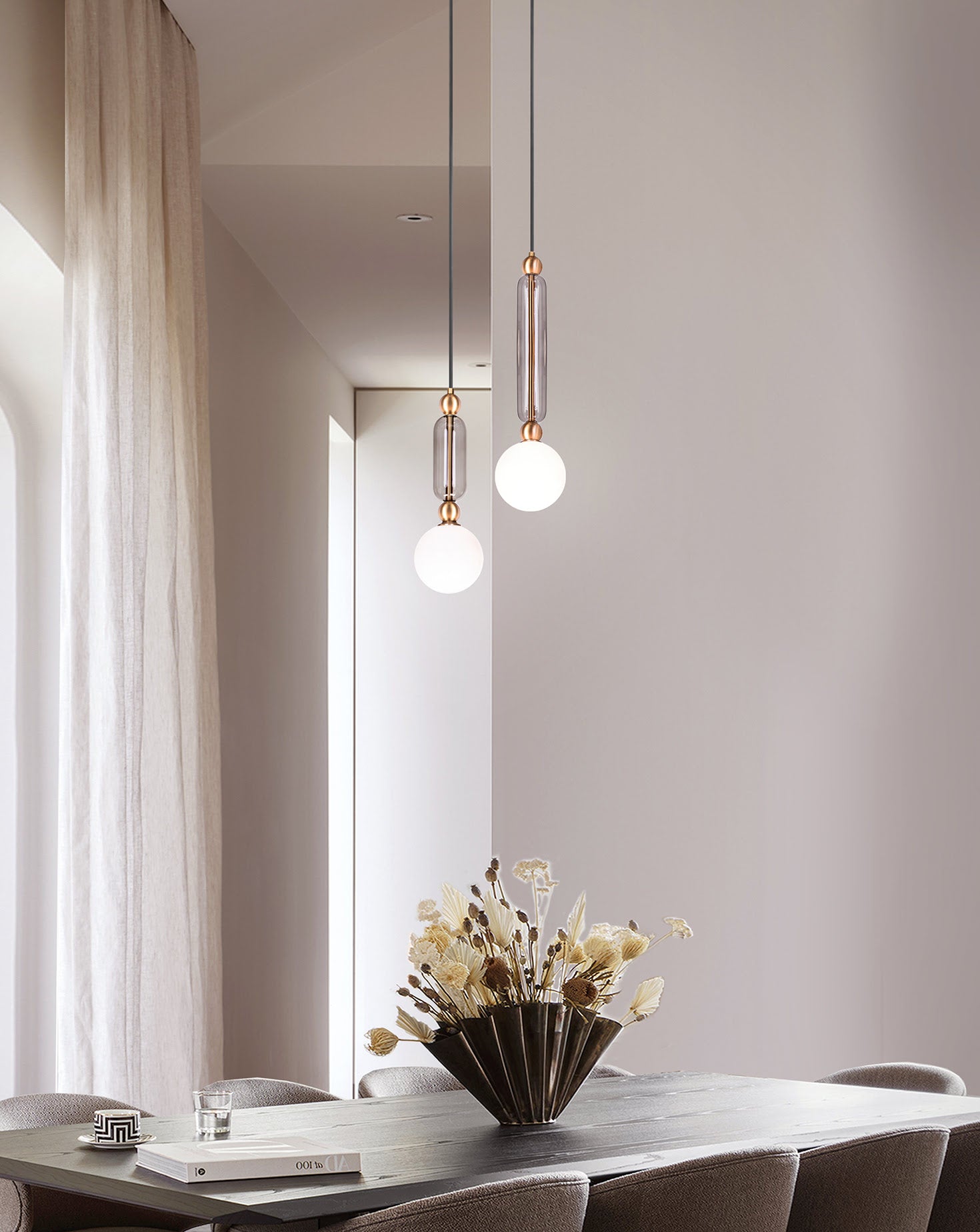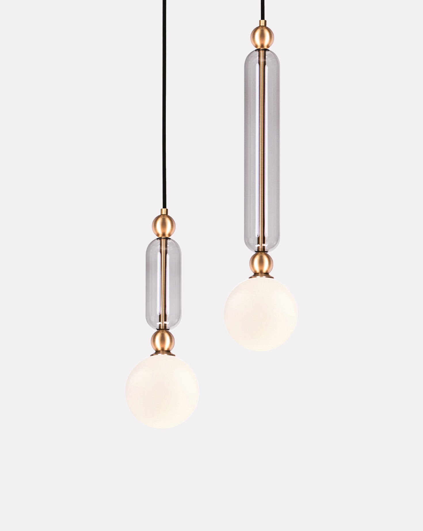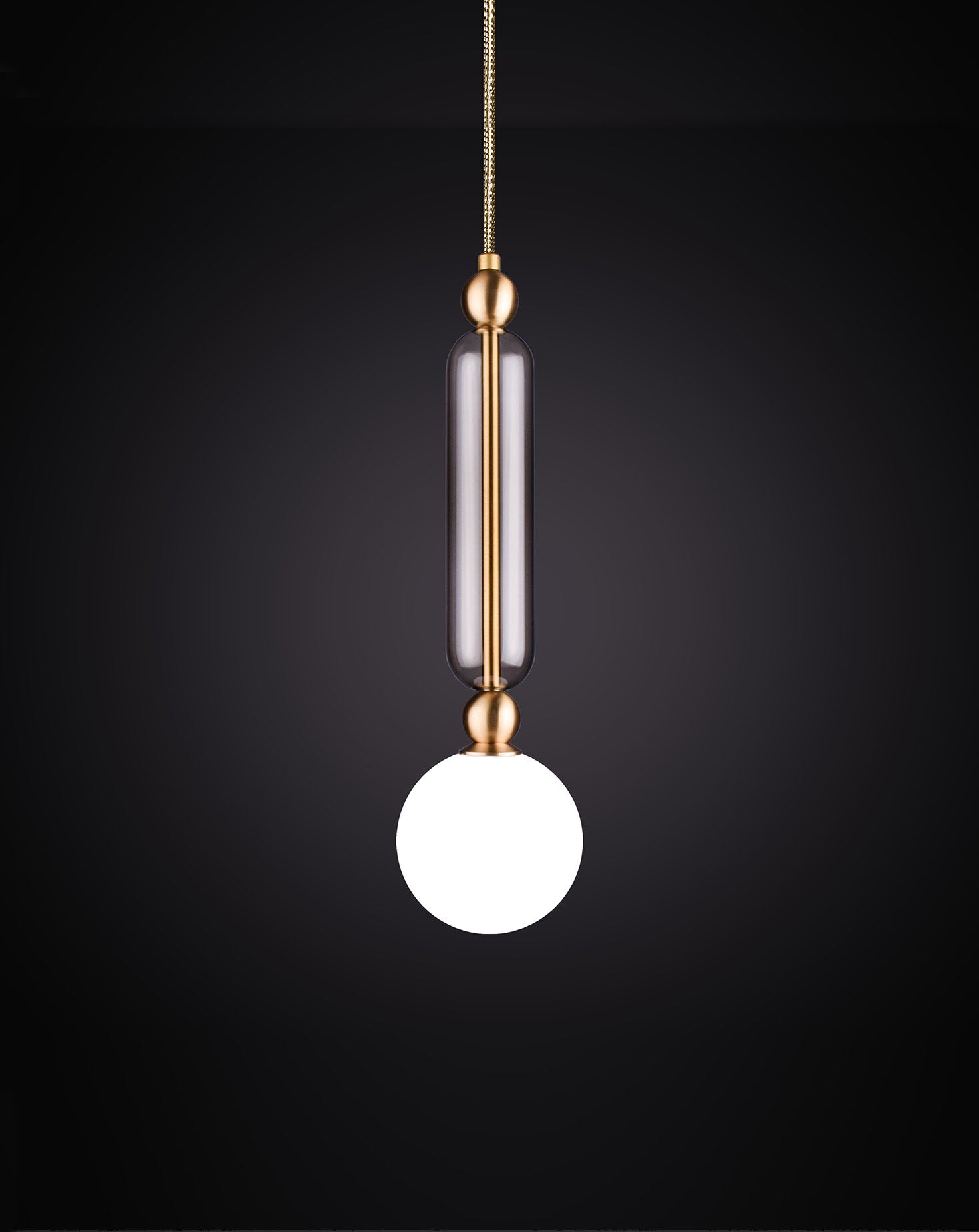 Case Pendant is a sculptural lighting design born from playful experimentation with glass forms. A brushed brass arm is encased within a smoked crystal glass tube and joined to a glowing opal orb by solid brass connectors, creating a striking vertical silhouette.