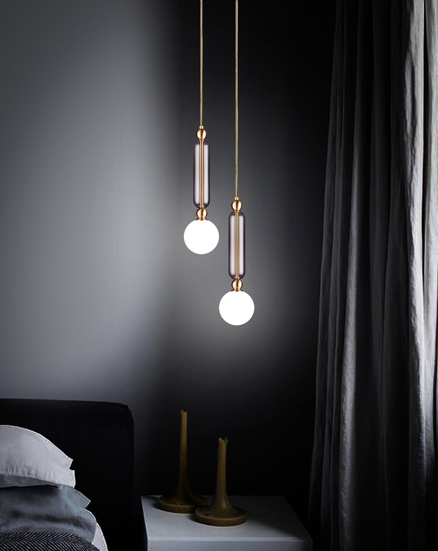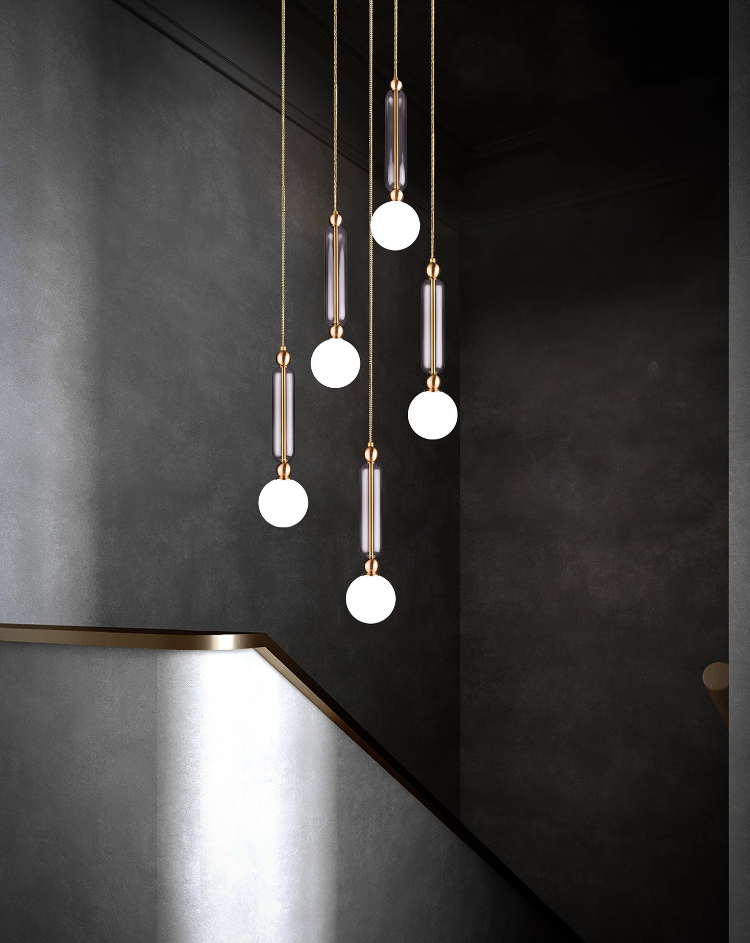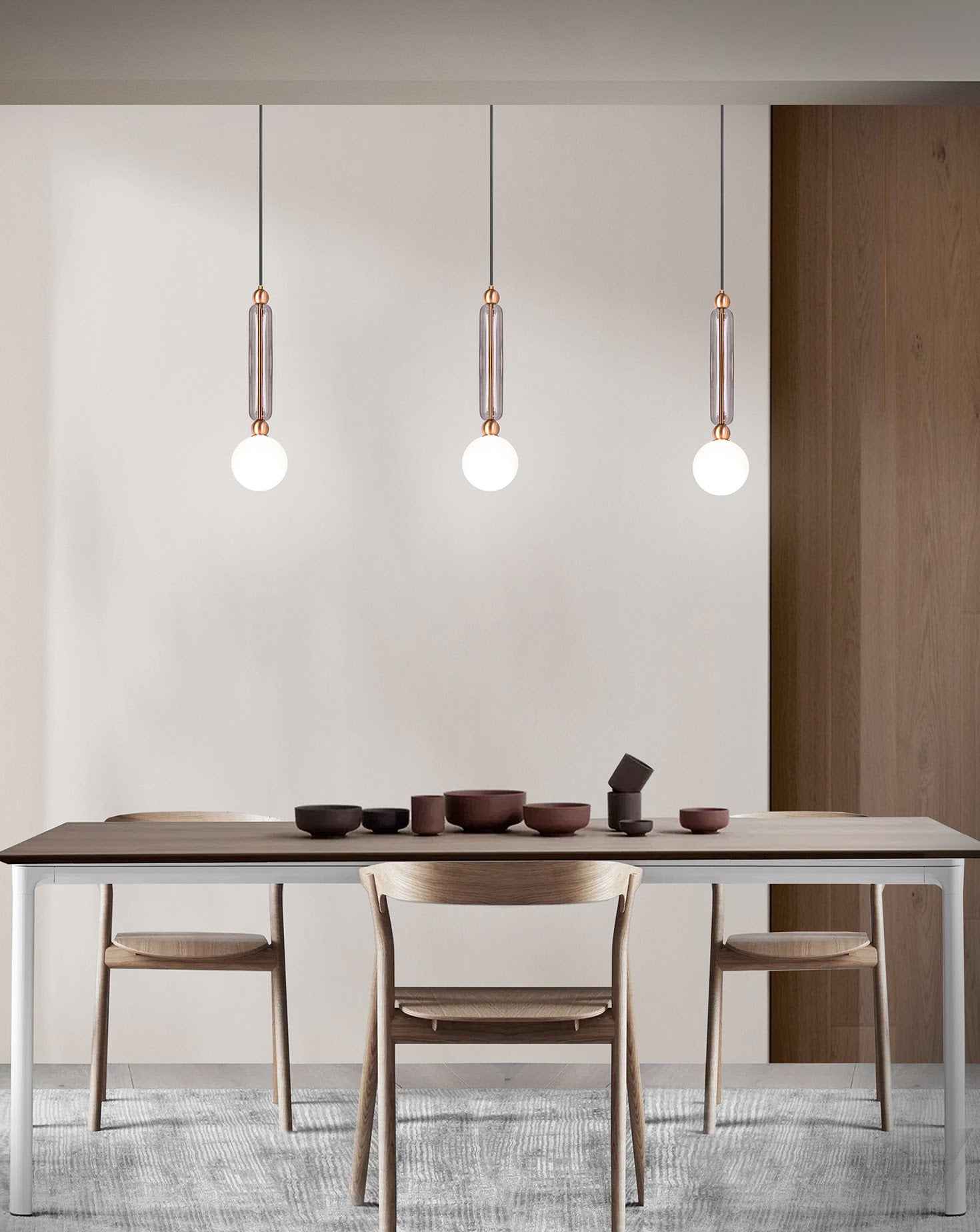 Case Pendant is a sculptural lighting design born from playful experimentation with glass forms. A brushed brass arm is encased within a smoked crystal glass tube and joined to a glowing opal orb by solid brass connectors, creating a striking vertical silhouette.