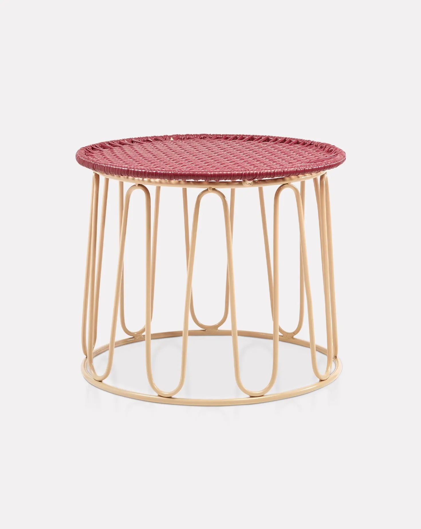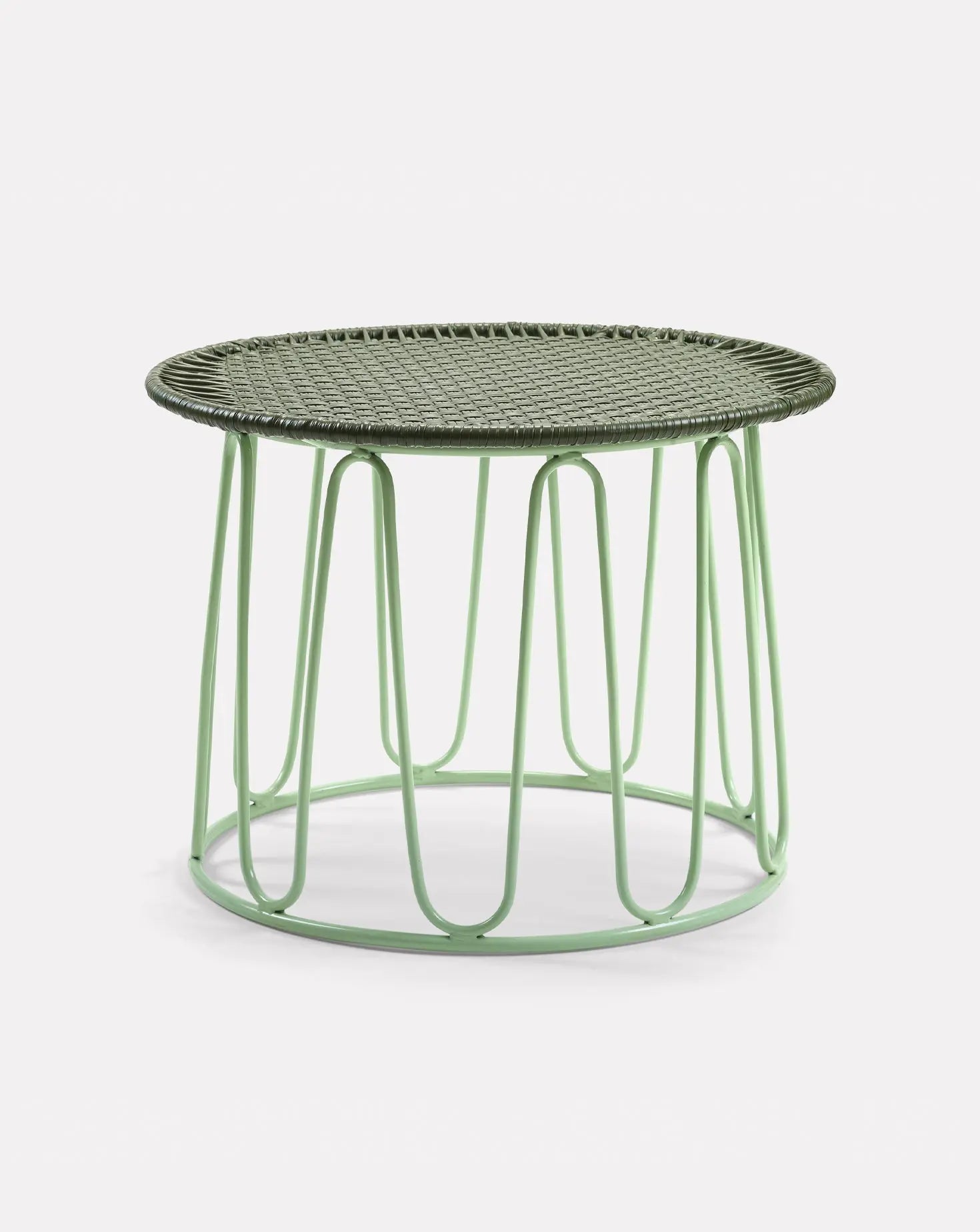 It is made by Colombian artesanos and artesanas using a technique called “momposino” – a method that is especially popular in Colombia's Santa Marta region on the Caribbean coast. The coloured strings are made from recycled PVC and are woven by hand around a fire-galvanised steel frame to create different patterns. The steel frame is fire galvanised to protect the material from rust and corrosion by bathing it in molten zinc. Afterwards, the frame is powder coated with a coloured lacquer. Just the preparation of all the materials takes 20 days, while the production of each table takes two days.