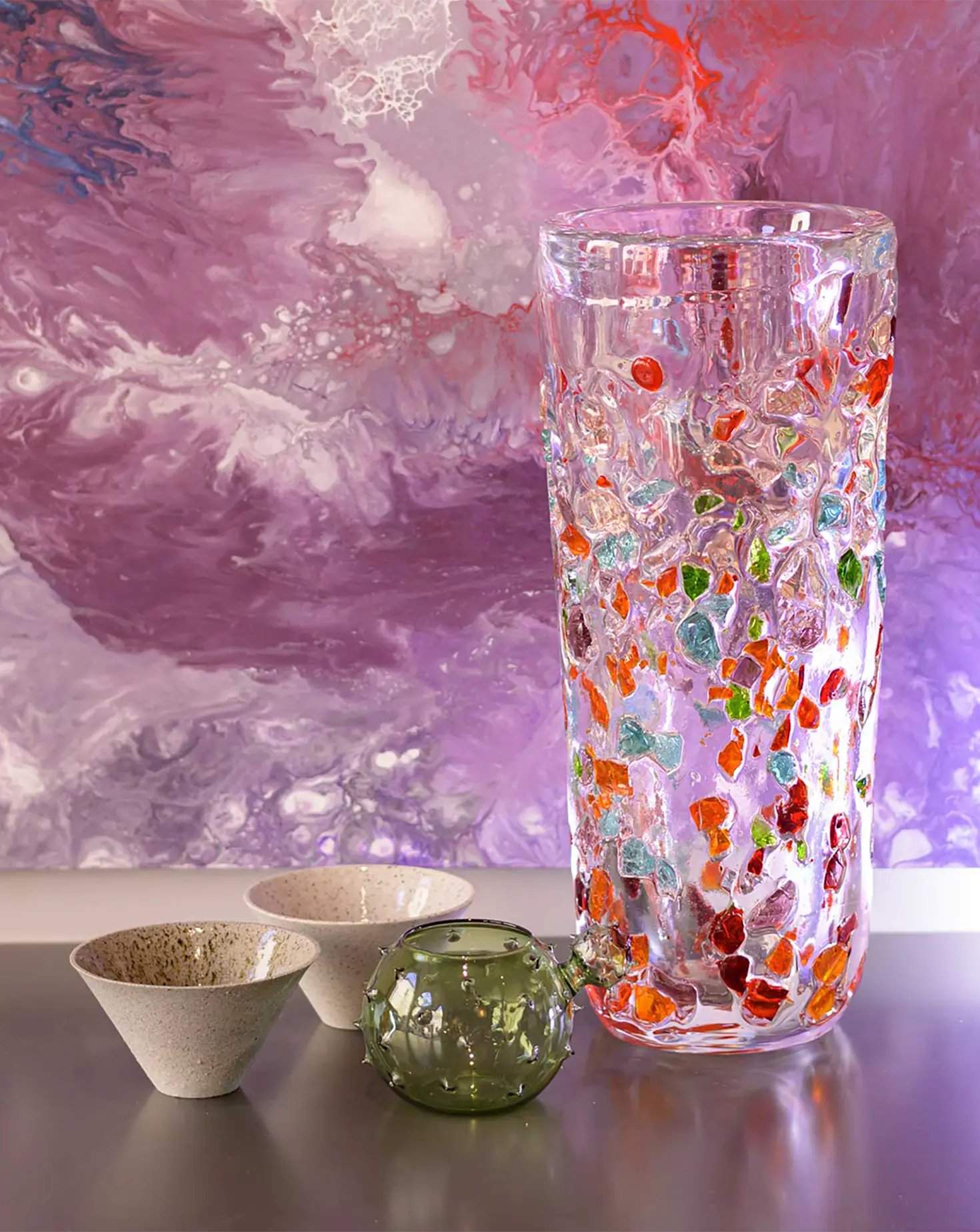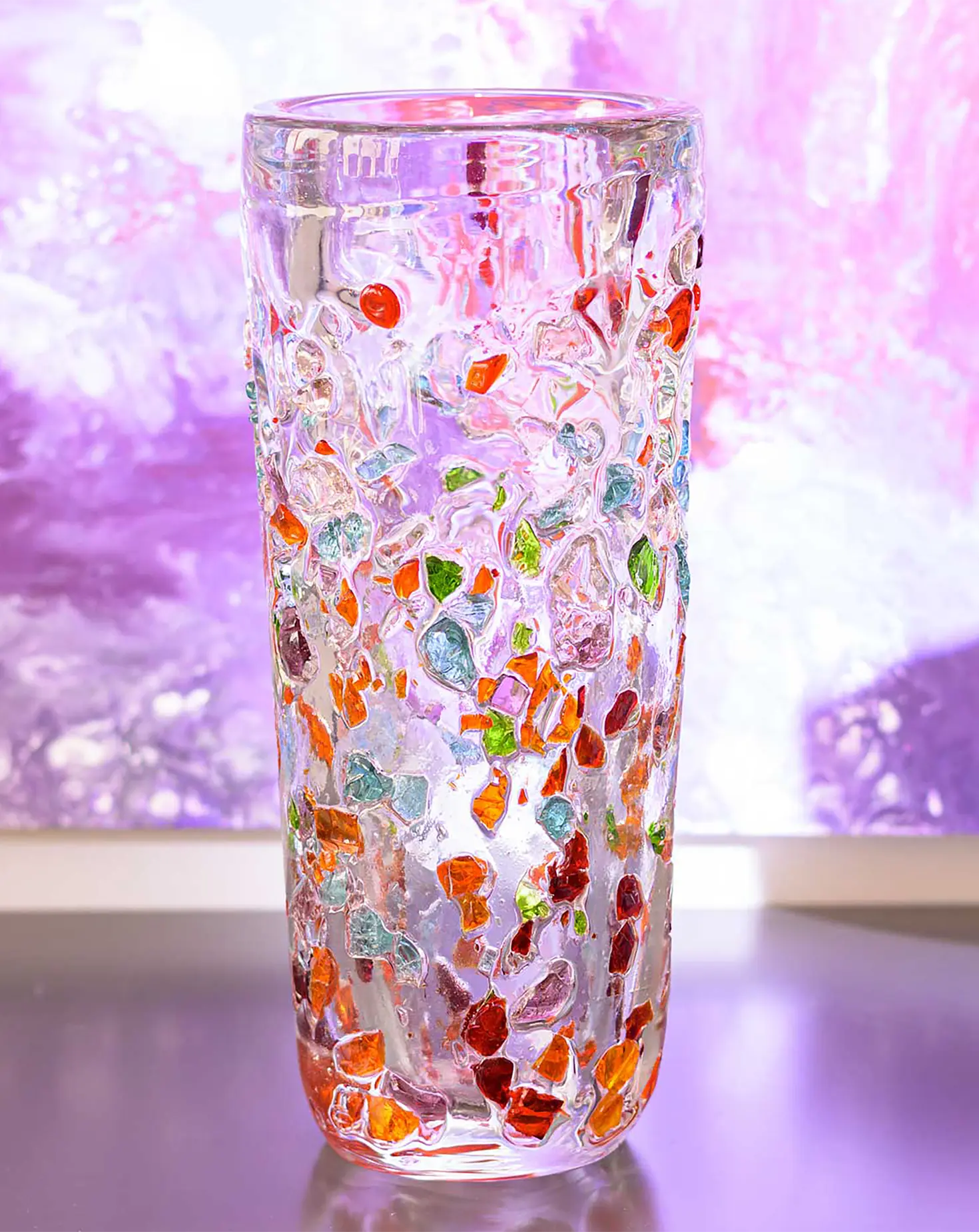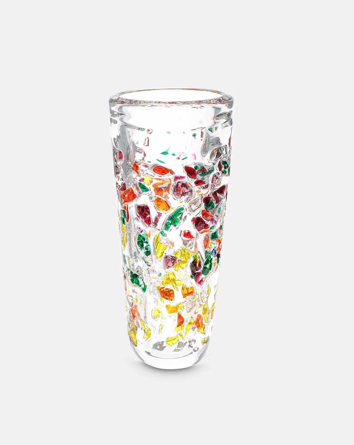 Entirely bespoke and made to order in Italy, the vase is crafted through a time-consuming process of firing, shaping, adorning with coloured glass pieces and extensive polishing.