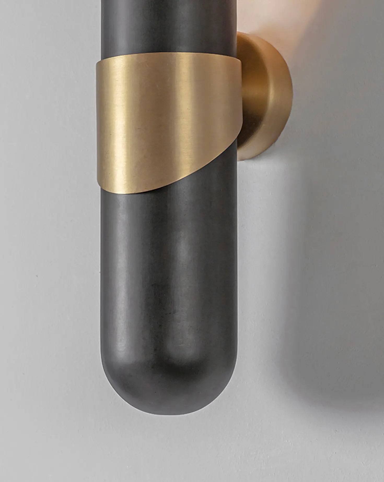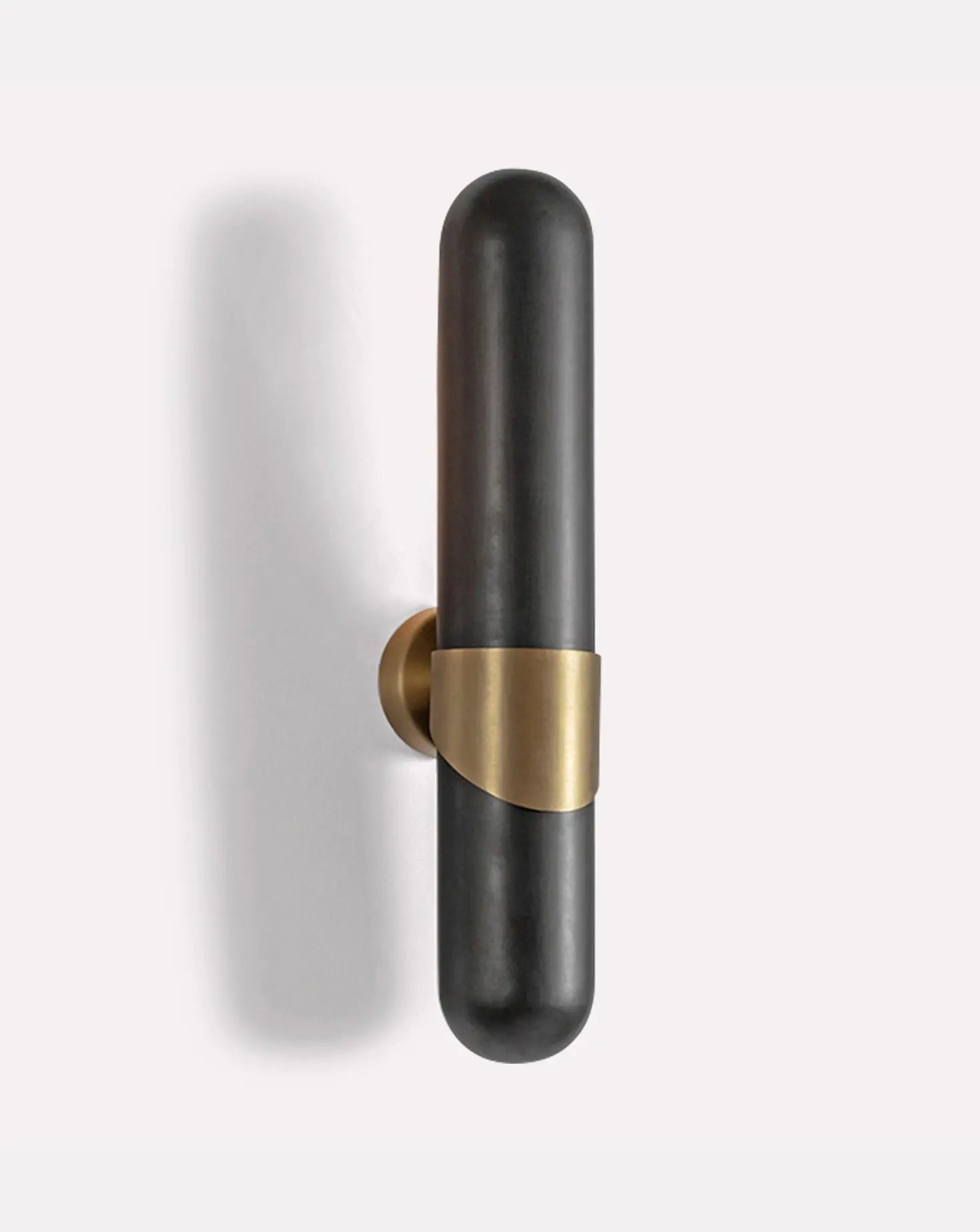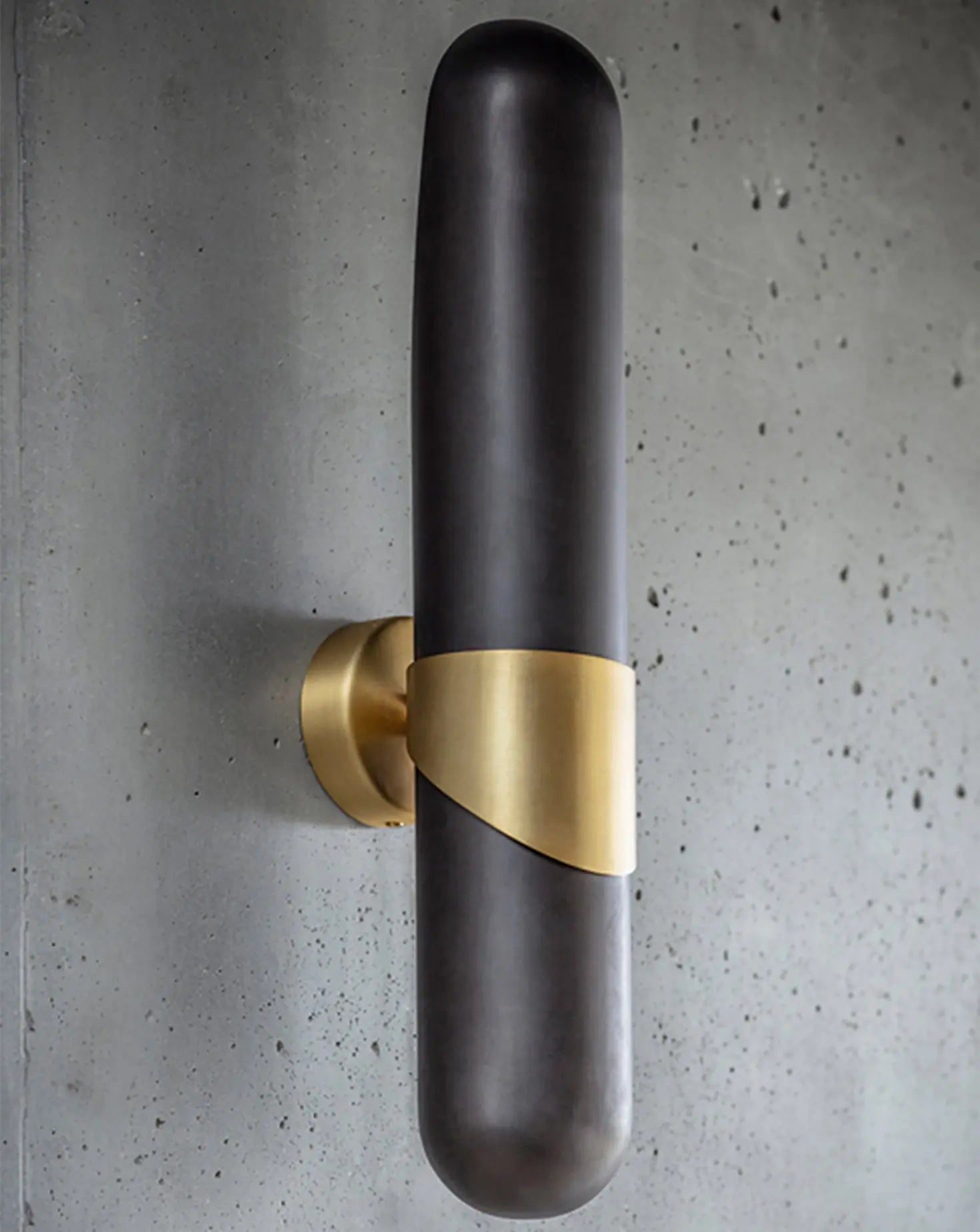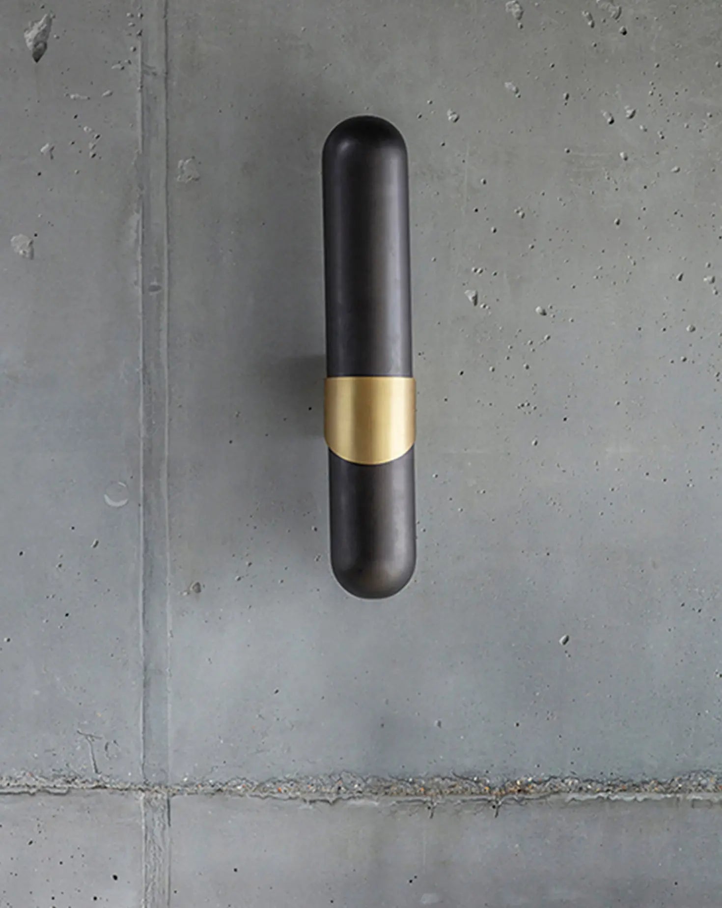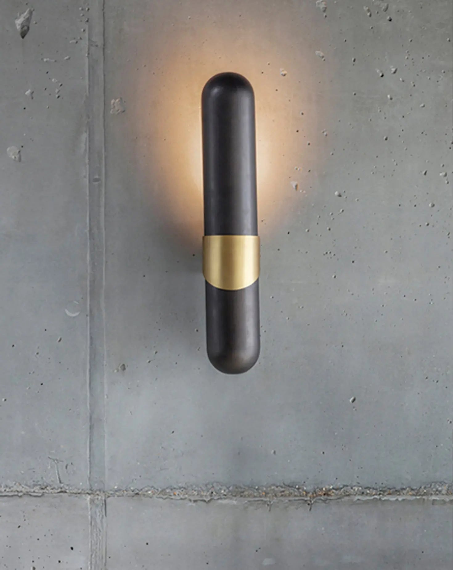 The Dream wall light is a cylindrical fixture designed with rounded edges. Made with a brass-finished inner side, it emits a soft and inviting glow, while the outer side features a black matte shop-sprayed metal finish for a modern aesthetic.