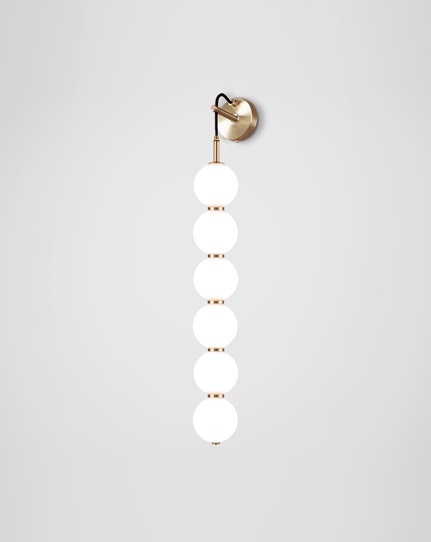 Echo 6 Ball Wall Lamp features six stacked opaline glass orbs that emit a soft, diffused glow, creating a rhythmic play of light and reflection. Suspended from a brushed brass fitting, it brings ambient warmth to any interior.