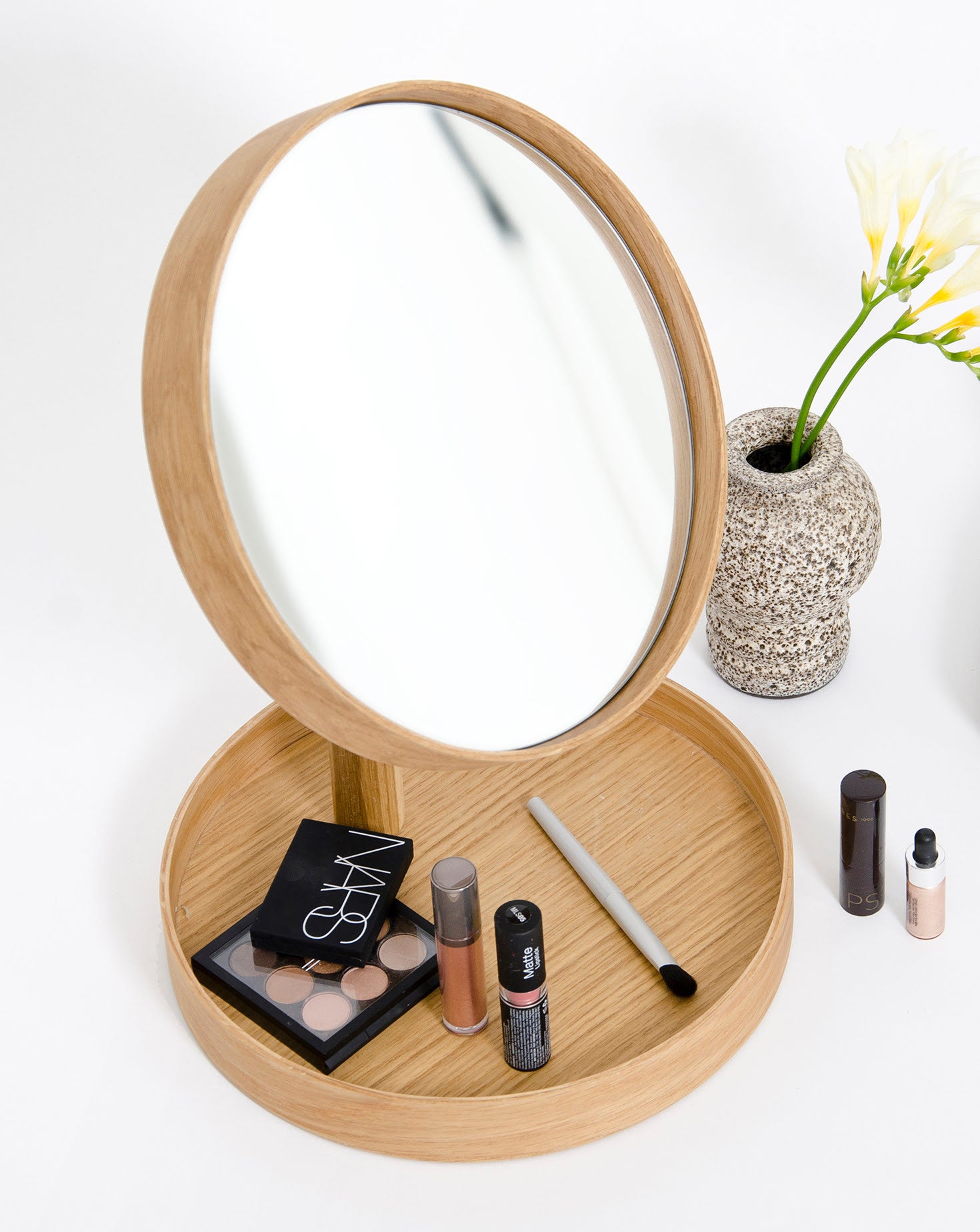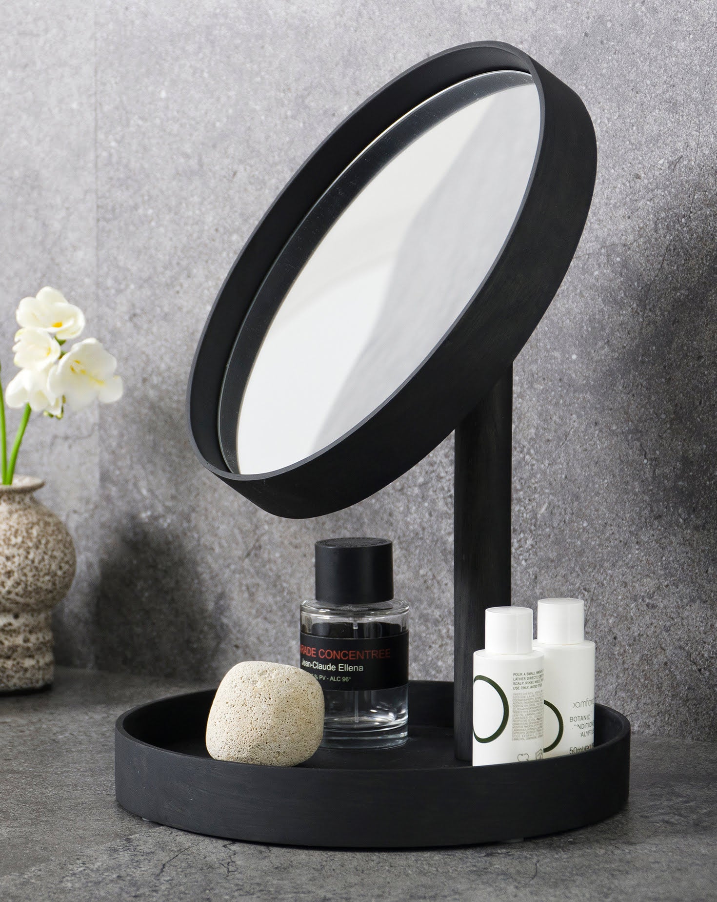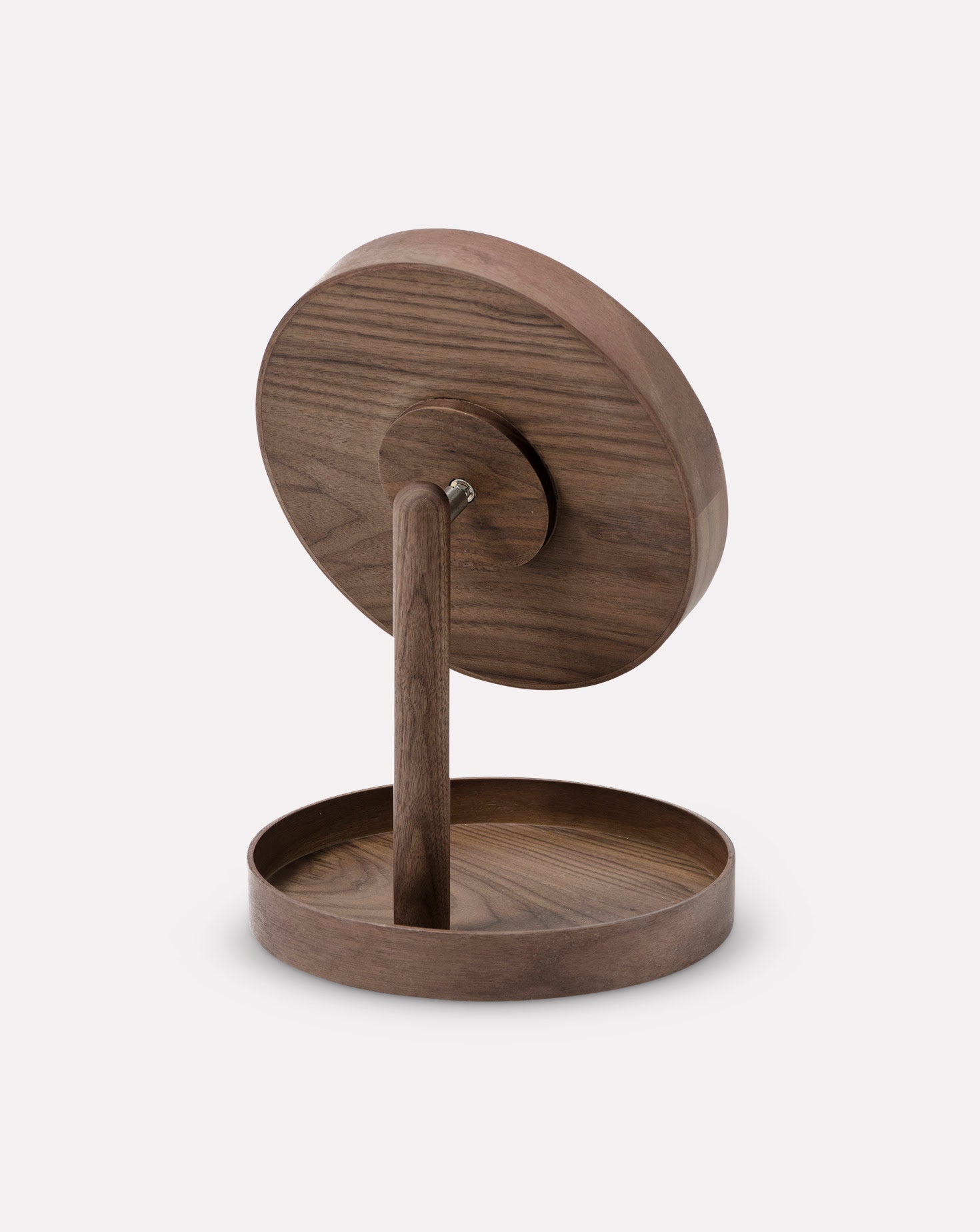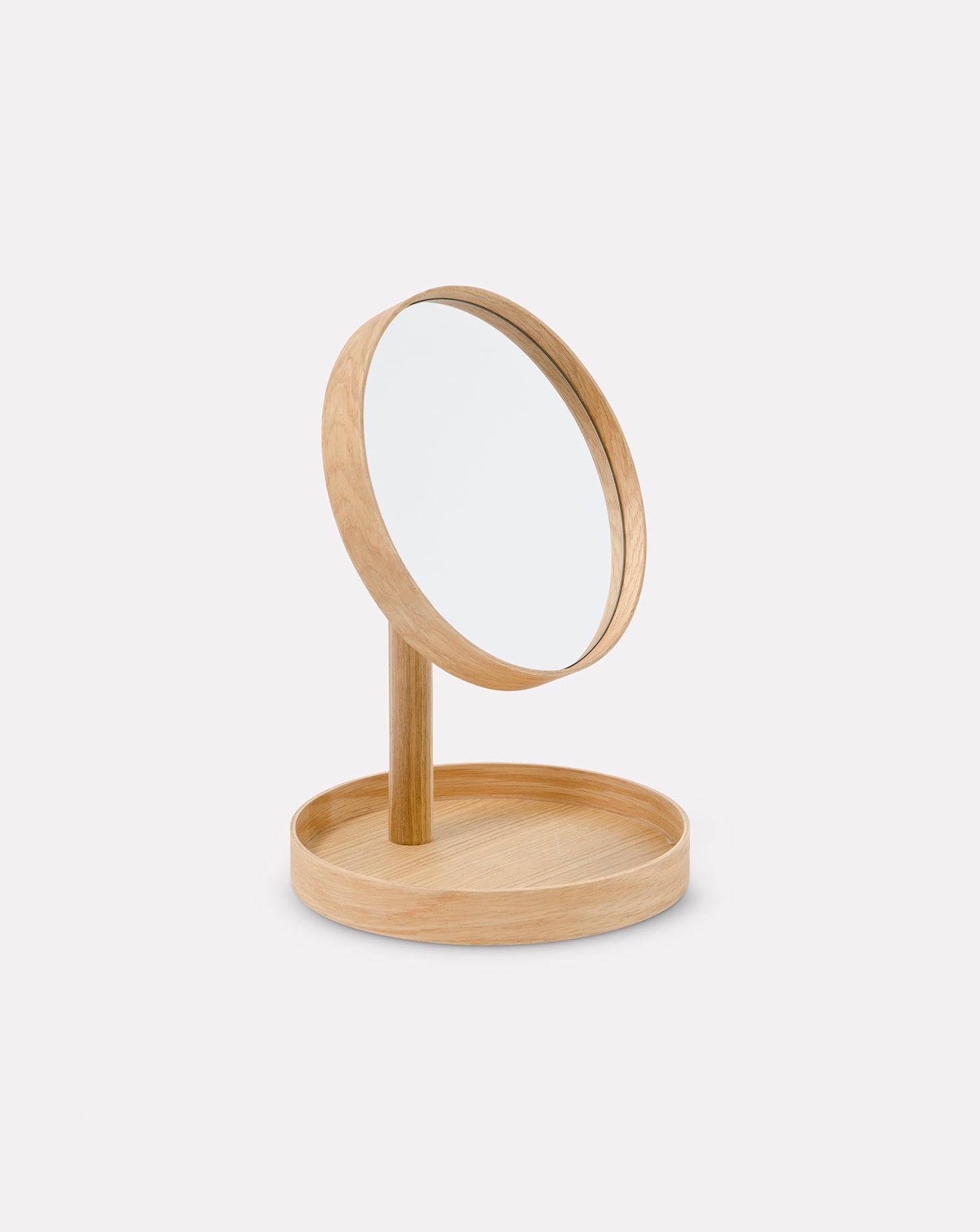 Look Magnify Mirror features a sleek round mirror with a slim wooden edge and a sturdy base that doubles as a storage tray for personal items. Perfect for dressing tables, bathrooms, or as a decorative piece, it offers practical functionality. The mirror provides 2x magnification and a tilting mechanism, ensuring the ideal viewing angle. With a 245mm diameter, it offers a full-face view.