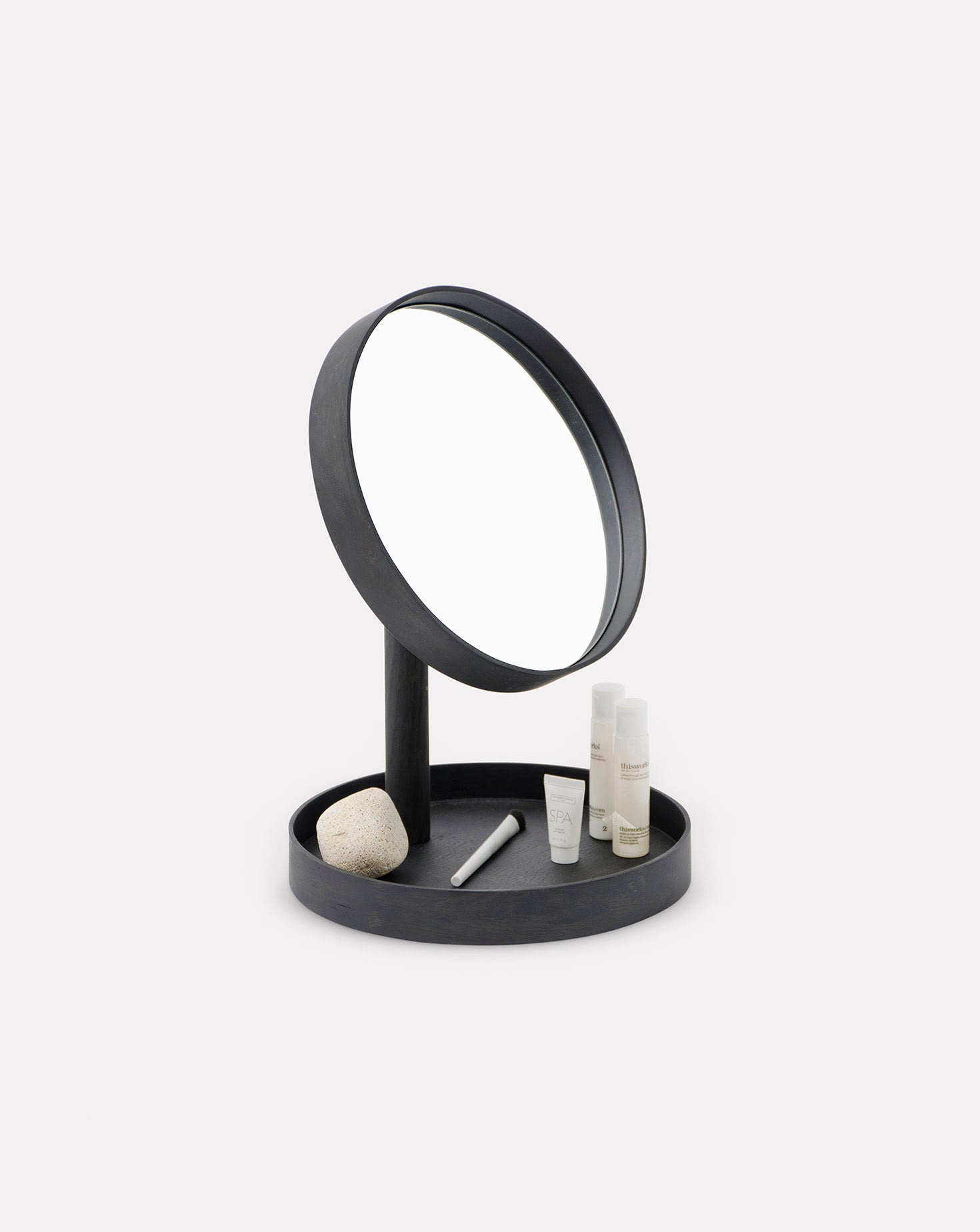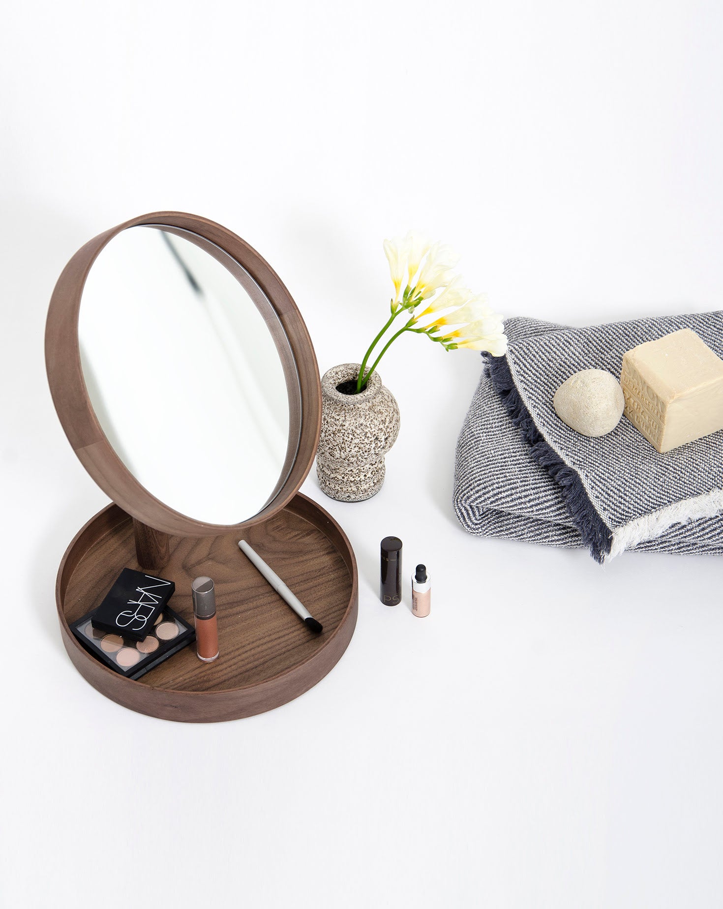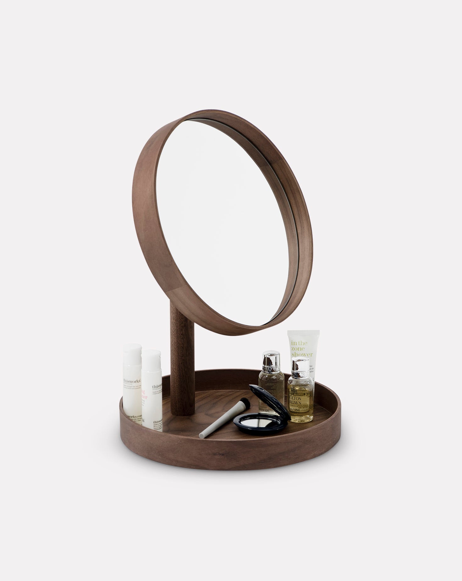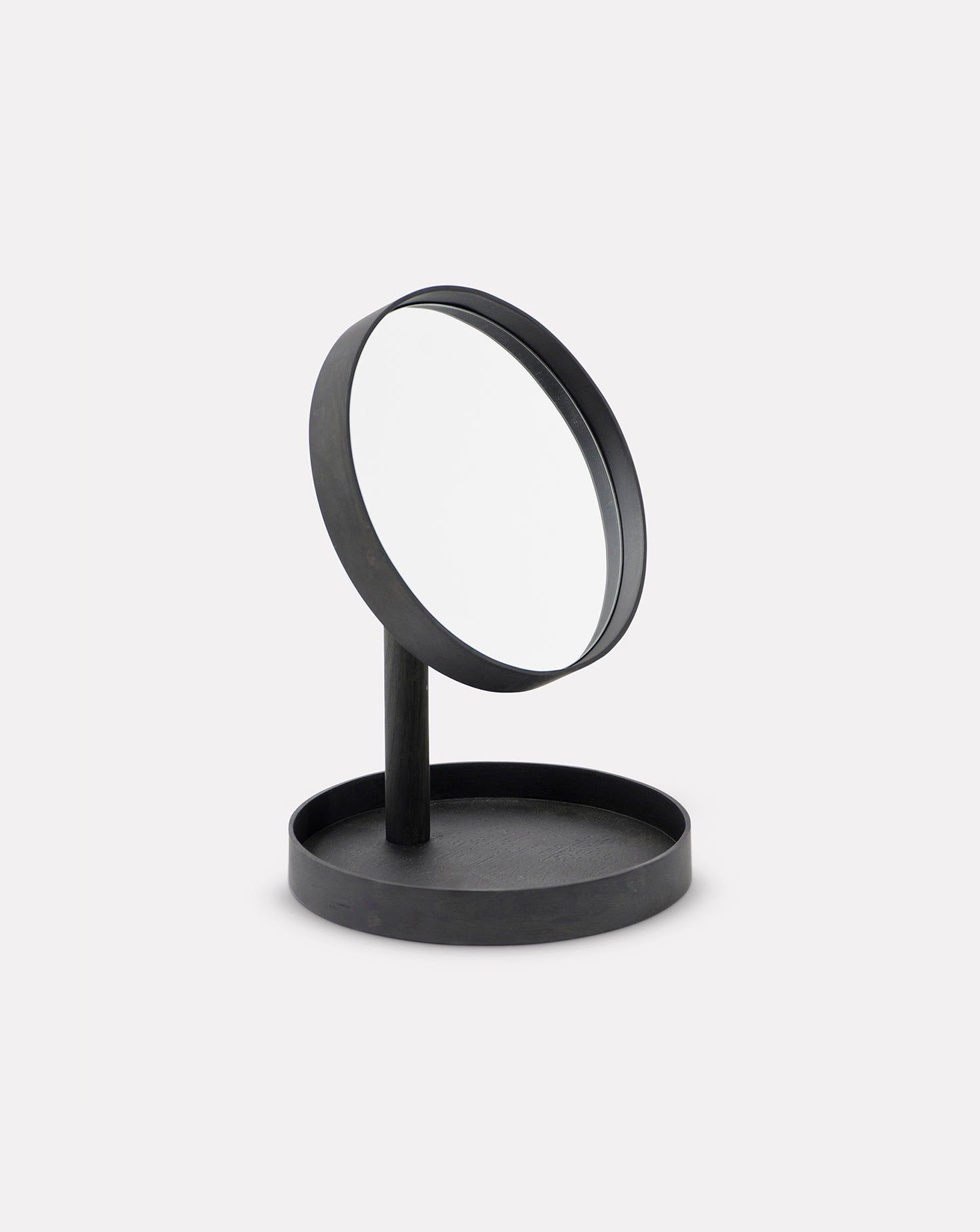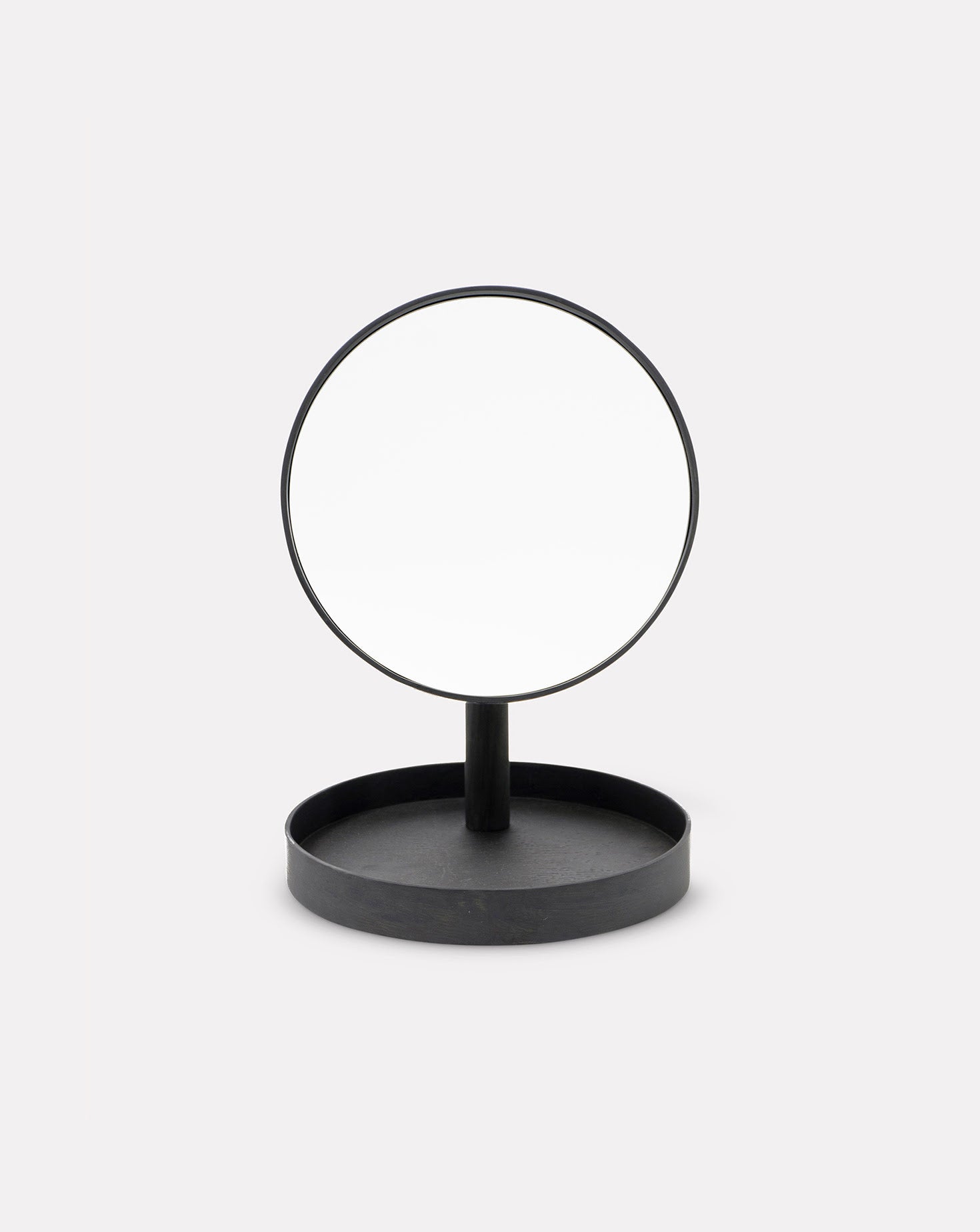 Look Magnify Mirror features a sleek round mirror with a slim wooden edge and a sturdy base that doubles as a storage tray for personal items. Perfect for dressing tables, bathrooms, or as a decorative piece, it offers practical functionality. The mirror provides 2x magnification and a tilting mechanism, ensuring the ideal viewing angle. With a 245mm diameter, it offers a full-face view.
