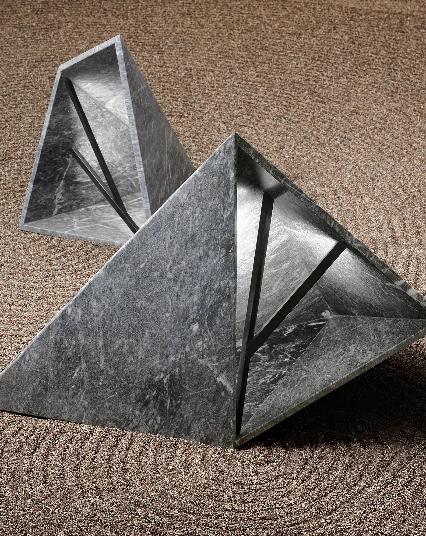 Crafted by Greek lighting designer Mariza Galani, Megalith is an outdoor floor light that embodies the essence of nature's beauty and delves into the marvels of the microcosm. Made from Greek marble, the work displays a variety of geometric shapes within a single piece, evoking the essence of ancient monoliths whose origins have been lost in time.