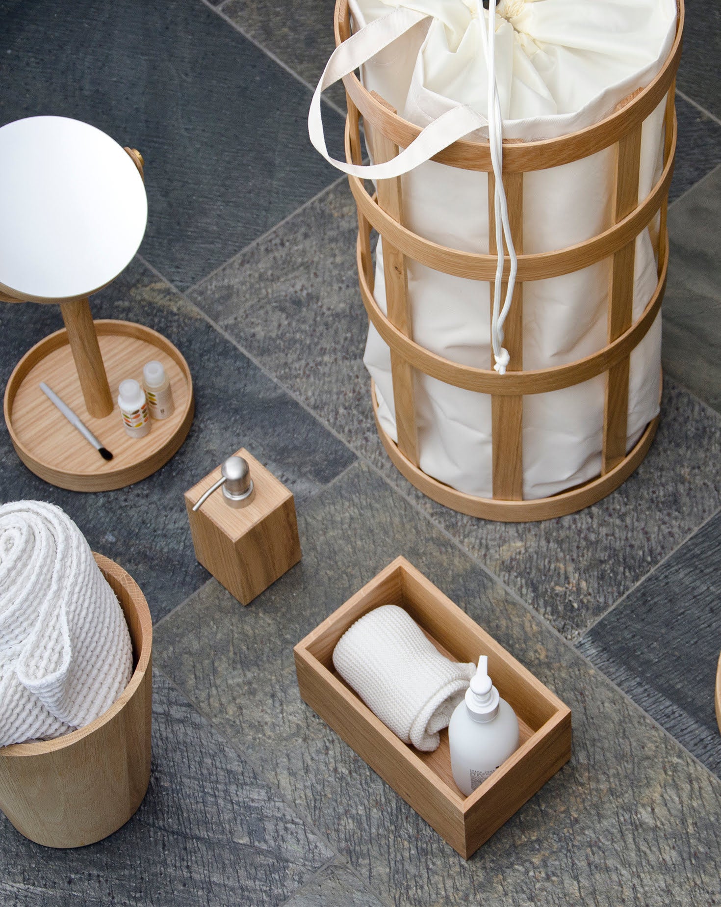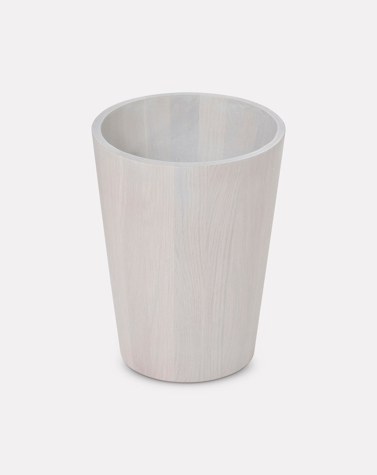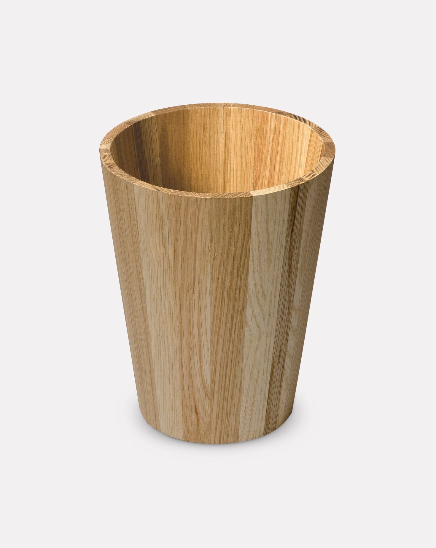 Mezza Round Bin offers a versatile solution for waste disposal, crafted from eighteen individual blocks of sustainably harvested wood, laminated together to form a distinctive conical shape. With a squared top and bottom edge, this bin brings a contemporary touch to any bathroom, bedroom, or office setting.