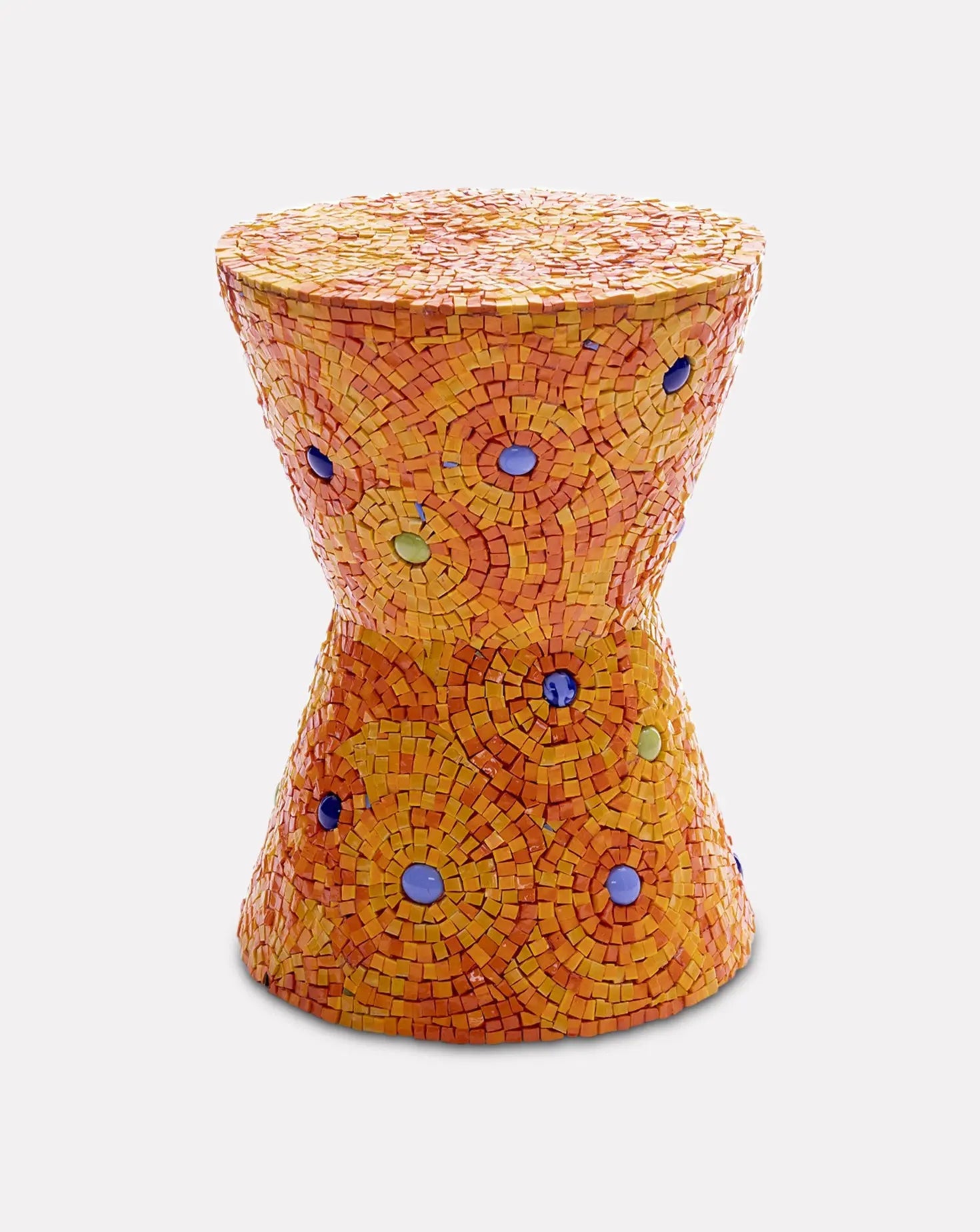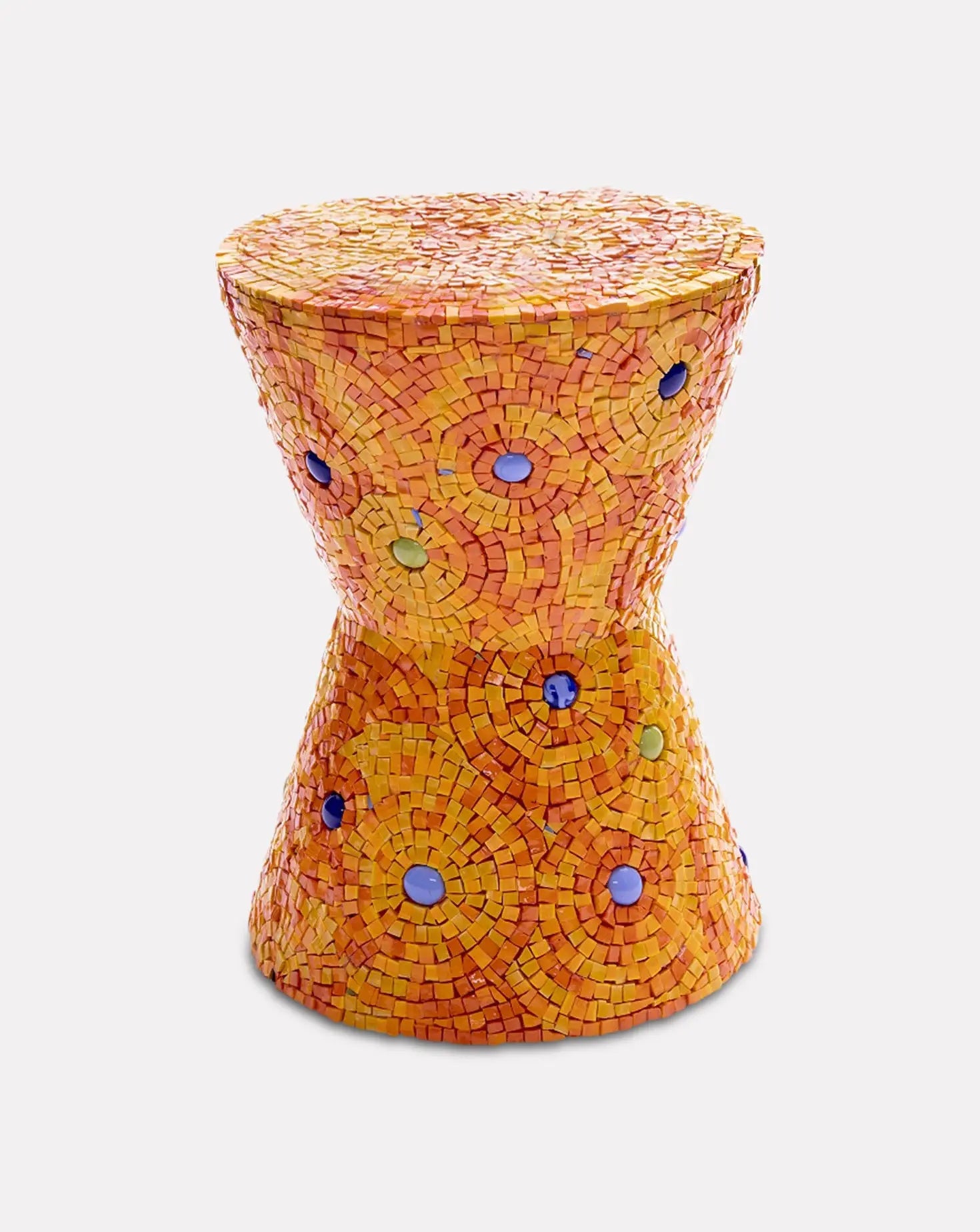 Constructed with a traditional mosaic pattern, the Bisanzio stool is designed by renowned Venetian mosaic artist Michela Nardin in collaboration with Casarialto. Handmade in Venice with 7,000 glass mosaic tiles in shades of green, light blue, blue, and multicoloured pearls, this exquisite piece captures the sun's myriad nuances.