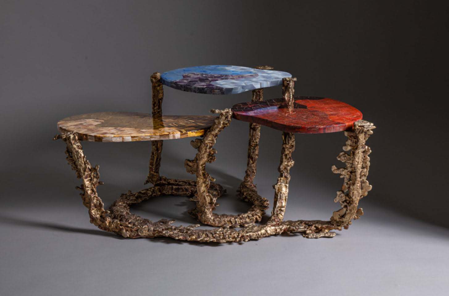 Its three tops are made from semiprecious stones, each believed to hold spiritual significance. The version shown at Alcova is part of a larger nested coffee table arrangement with seven tops representing the chakras in a fluid, connected form.