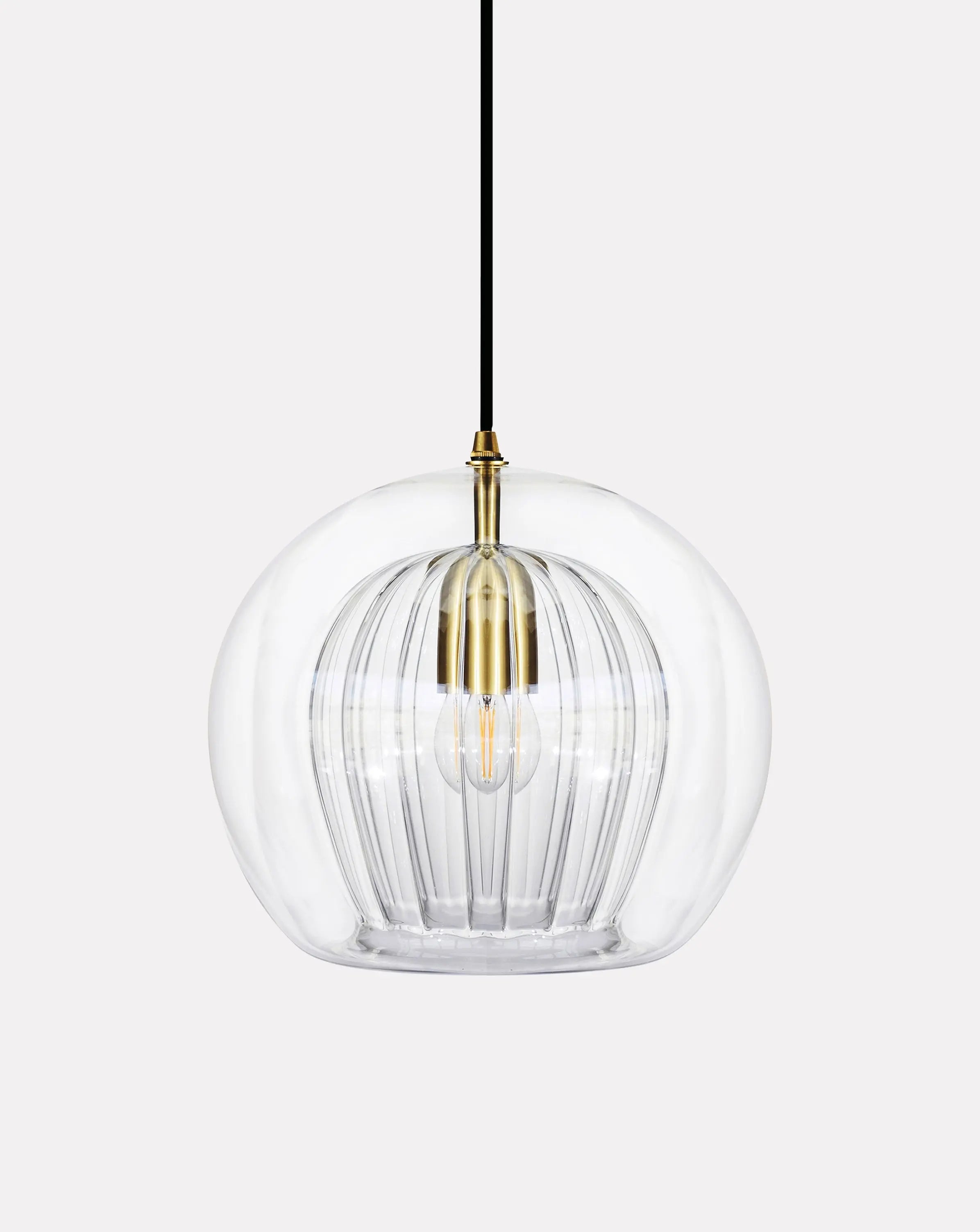 Designed with light play in mind, the five Pleated Crystal pendants in this cluster feature double-walled borosilicate glass shades that refract the light and sparkle with subtle colour. This version, made using clear glass and brushed brass, emits a warm glow. The five-piece pendant cluster is part of a wider Pleated Crystal collection that includes a wall lamp, a side light and a floor standing lamp, all handmade in Bohemia and London. Perfect above a dining table or in a entrance lobby, this piece makes a captivating focal point.
