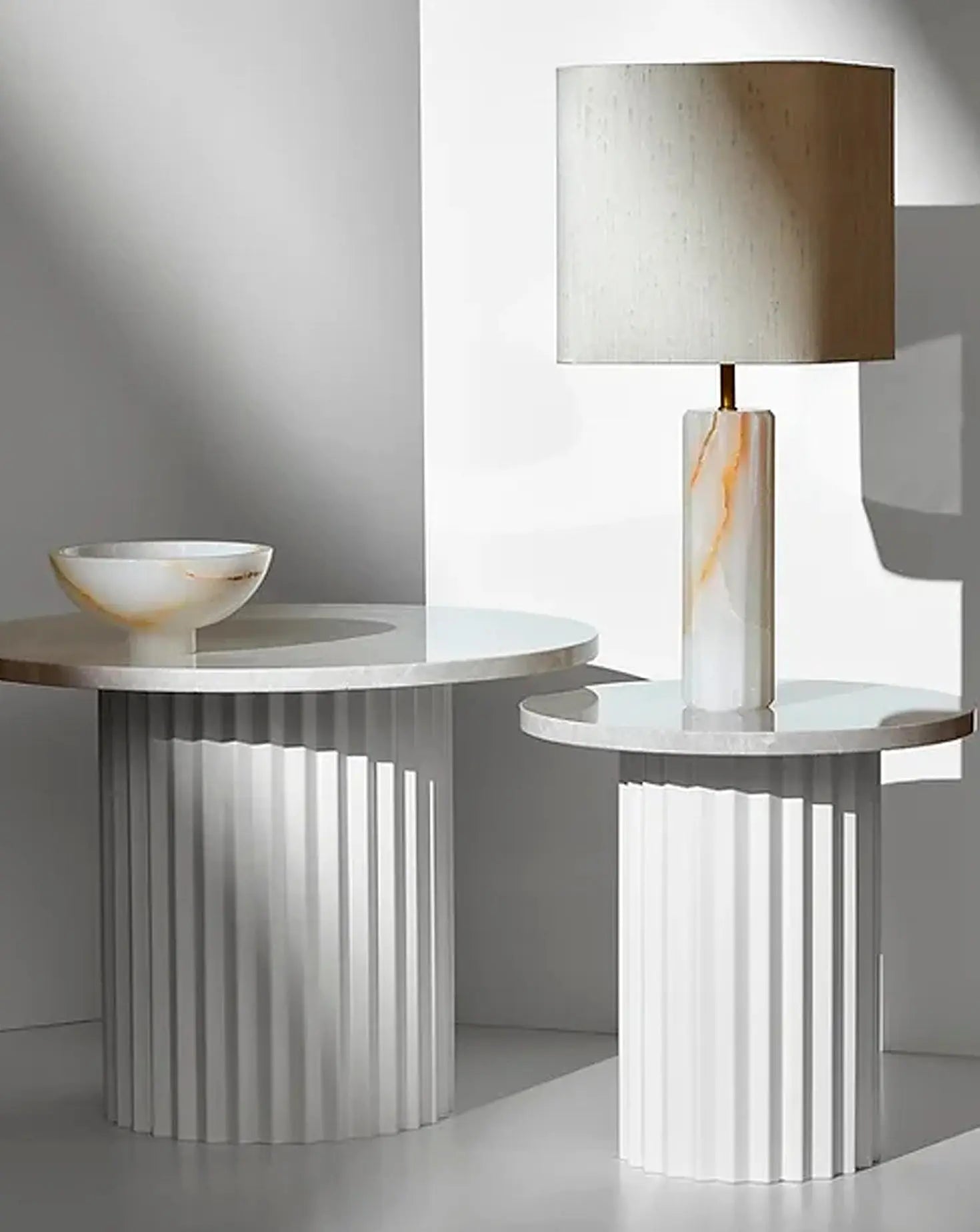 Danish designer Lisette Rützou’s Proud Table Lamp stands up straight and proud, with its solid stone base giving this statement lighting design a sense of permanence and quality. The robust stone contrasts with the soft silk lampshade, which produces a warm glow when the light is turned on. This version features a base in white onyx with a matching shade.