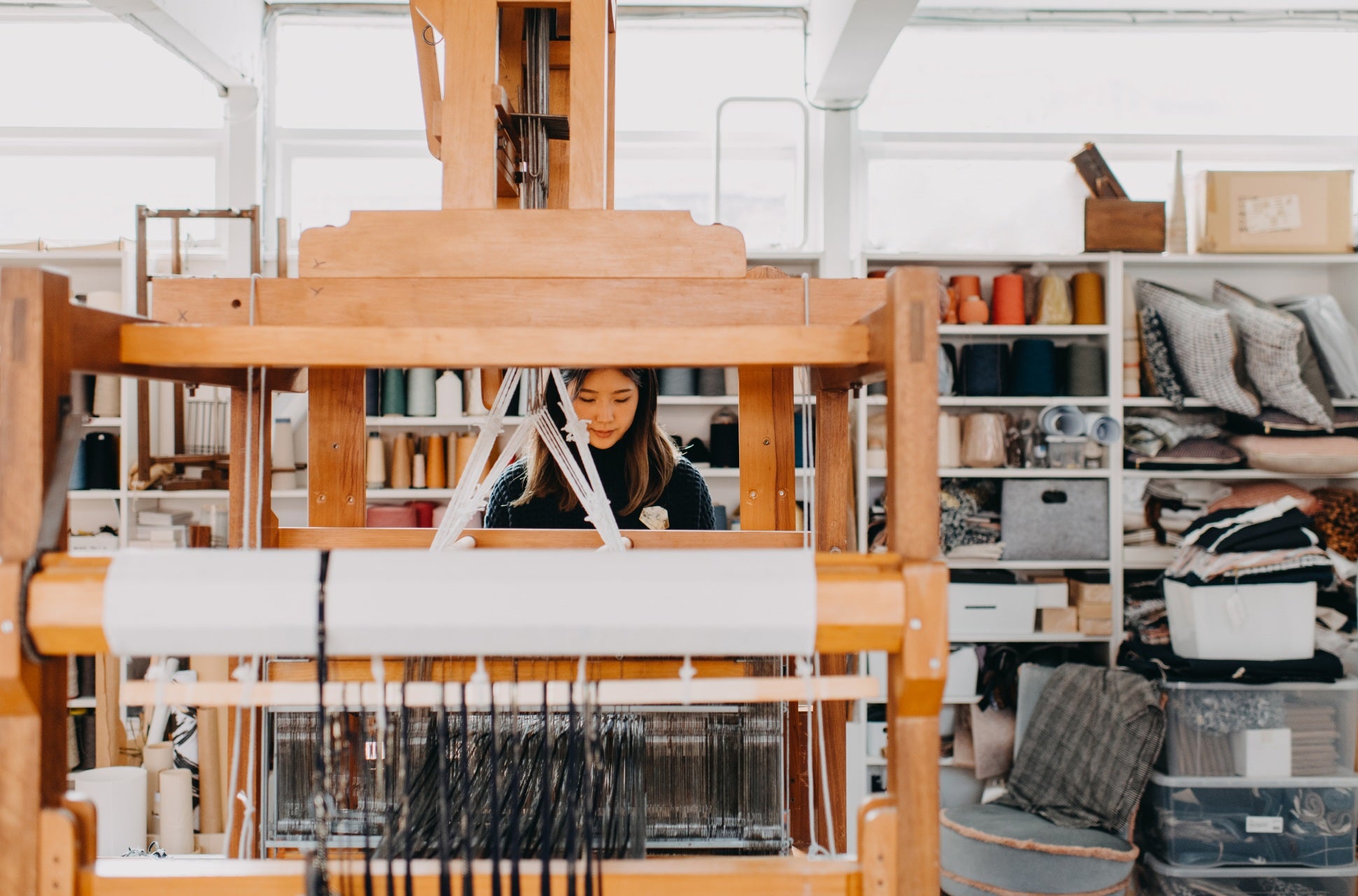 Strips of fabric combine to create ambiguous patterns that may evoke personal memories for the viewer. This triptych features undulating forms reminiscent of mountains, floating clouds or ocean waves. Each piece is hand woven using a mechanical loom at Momoka’s studio in Nottingham.