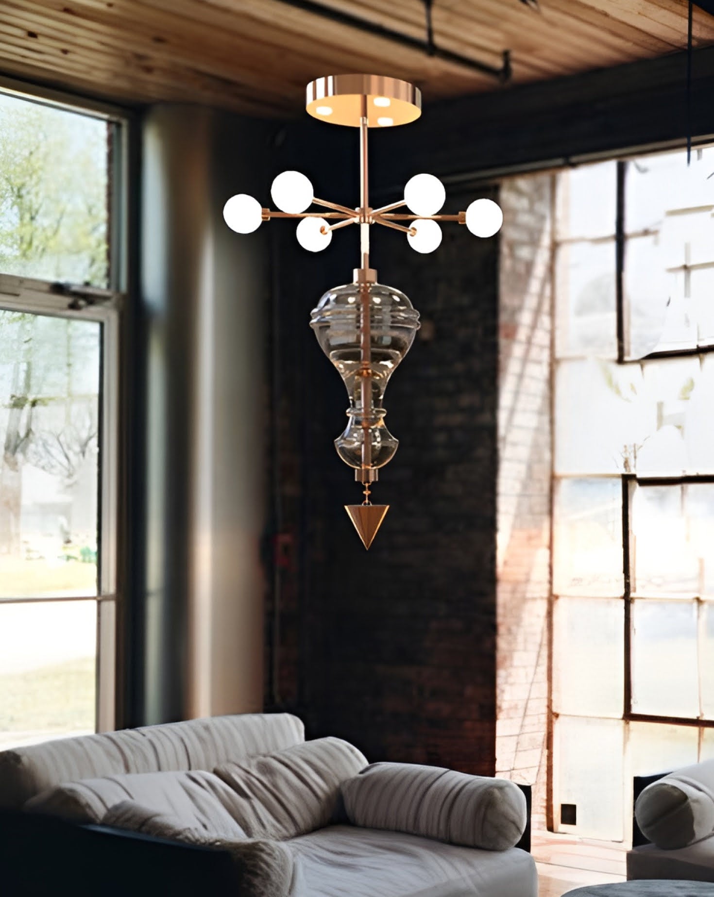 The Shikhara 4-Feet Hanging Pendant Light features a striking glass form paired with radial white globes and a conical brass end, creating a bold centerpiece.