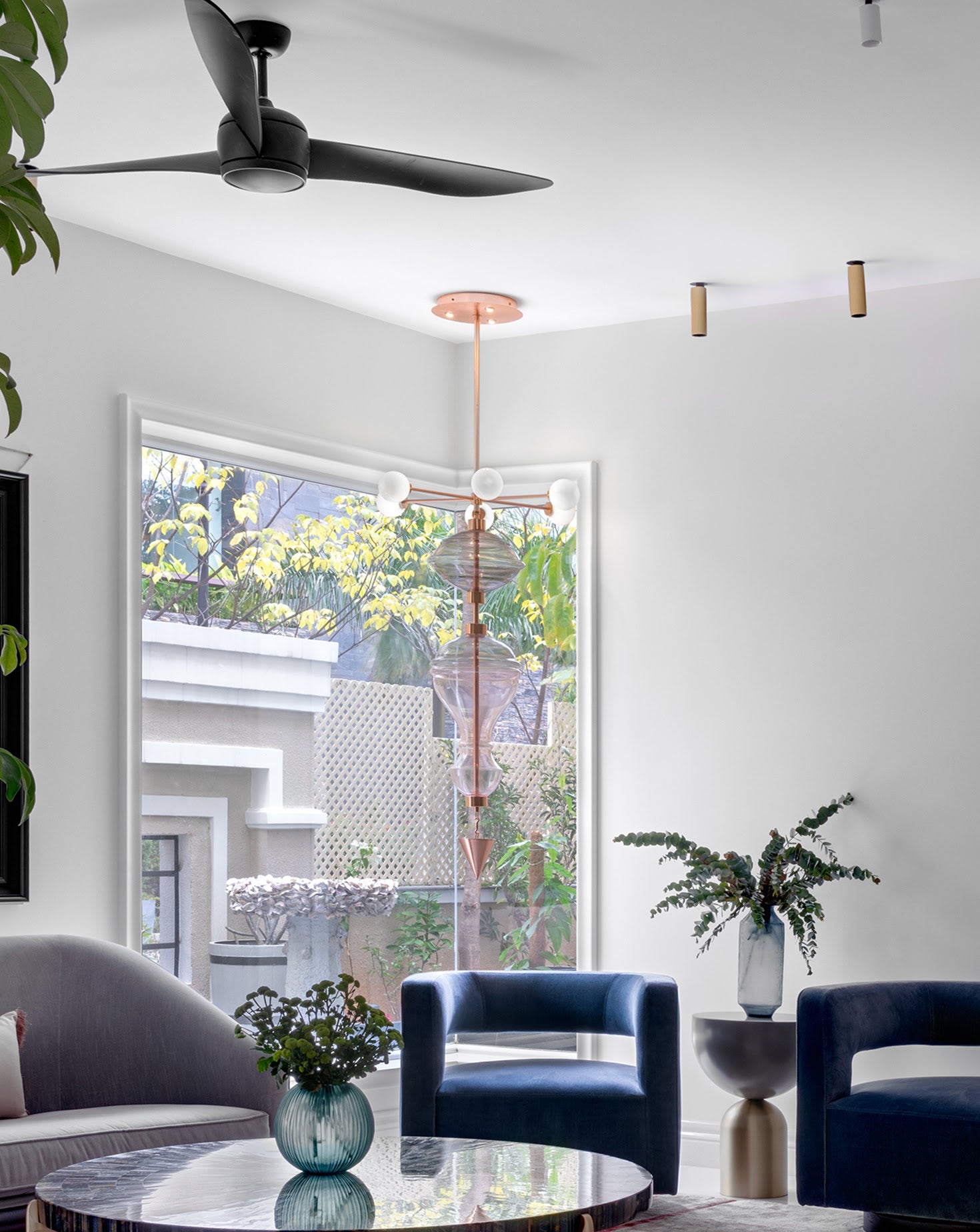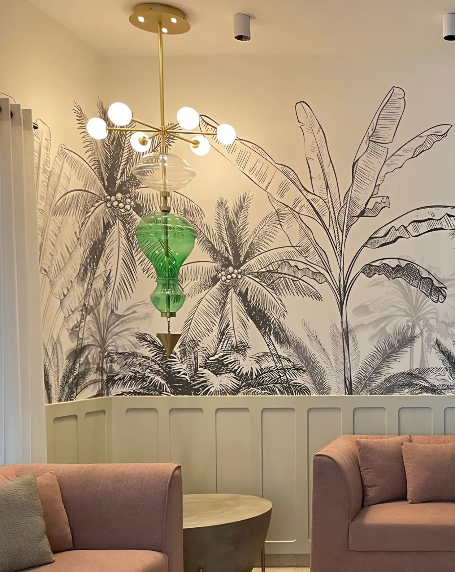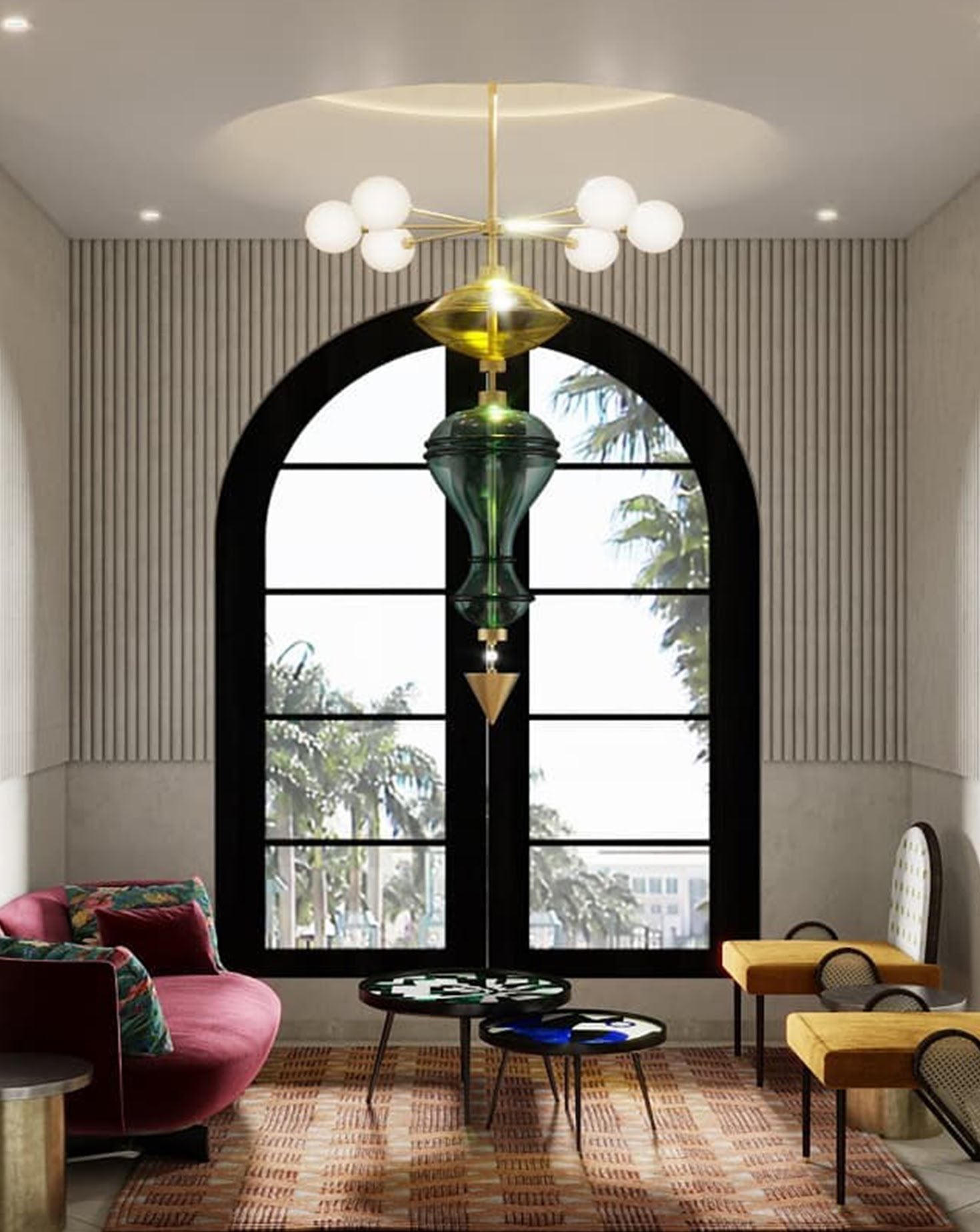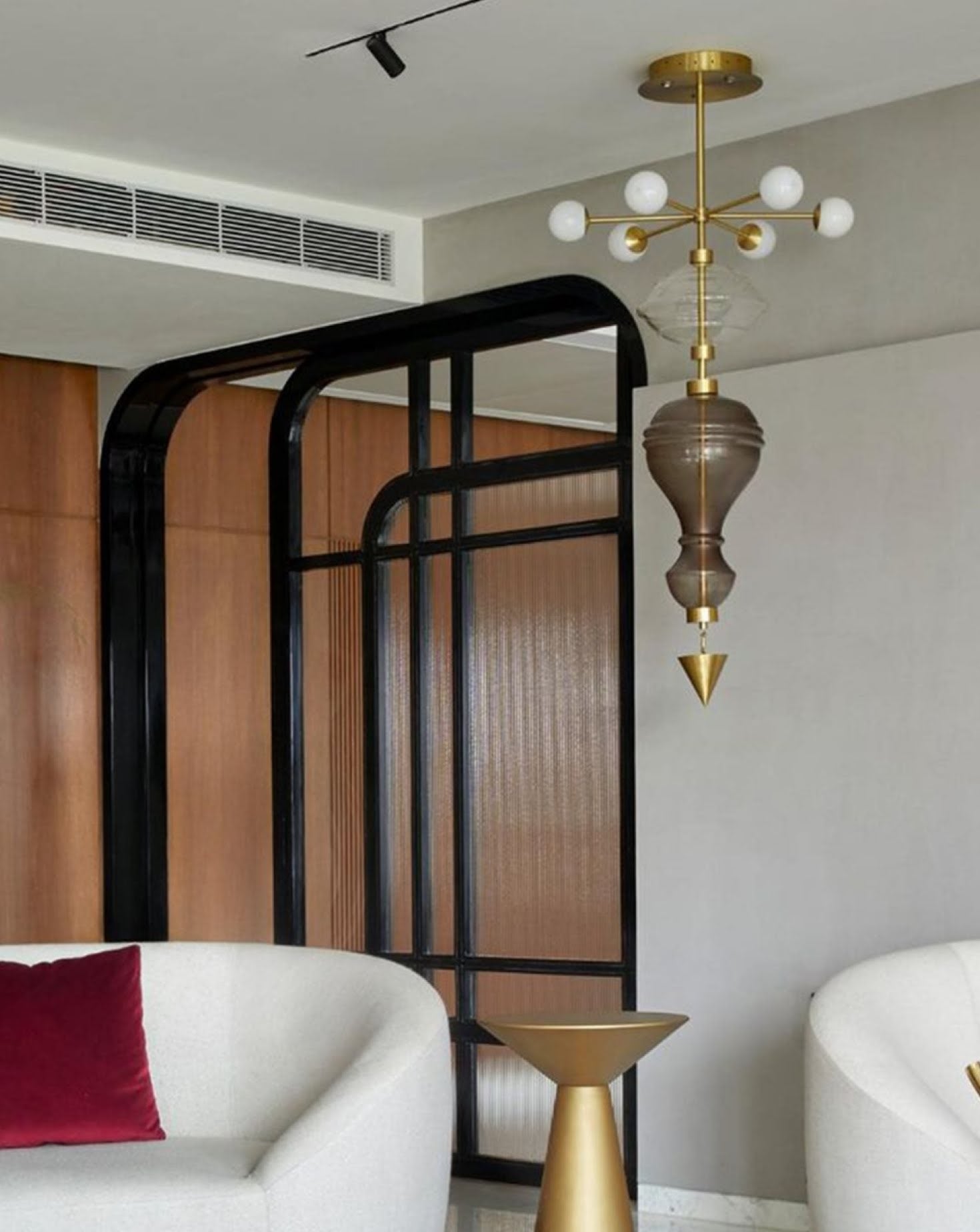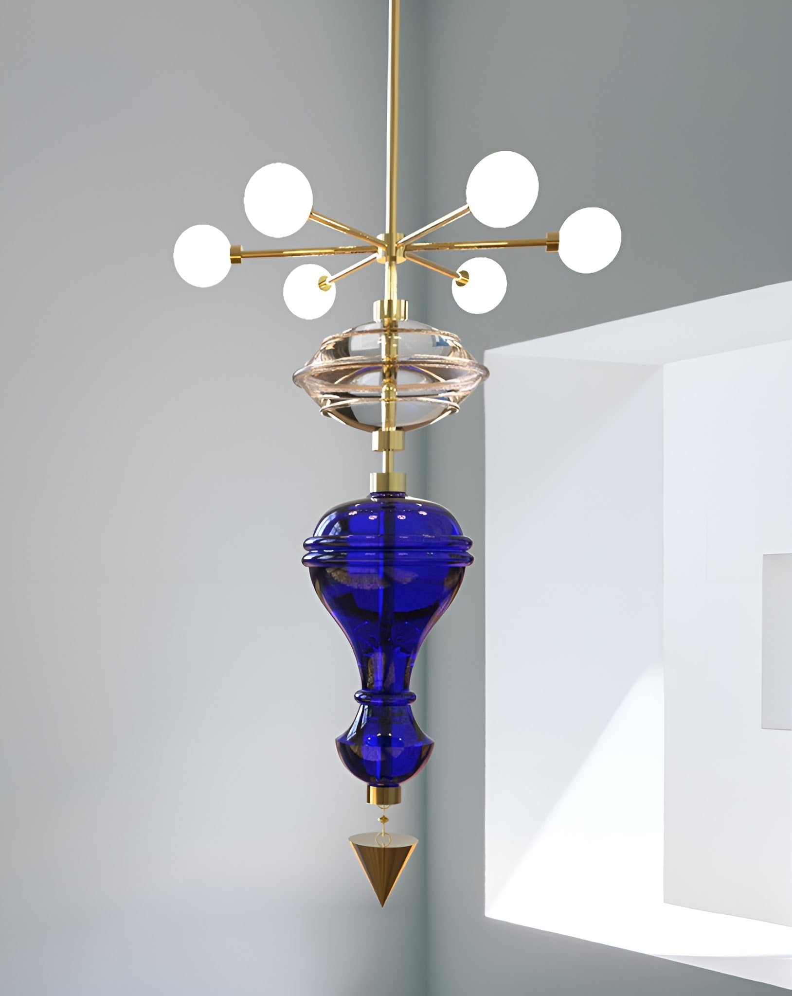 The Shikhara 6-Feet Hanging Pendant Light features a striking combination of two Shikhara glass forms, layered in contrasting colors to create a visually stunning suspended design.