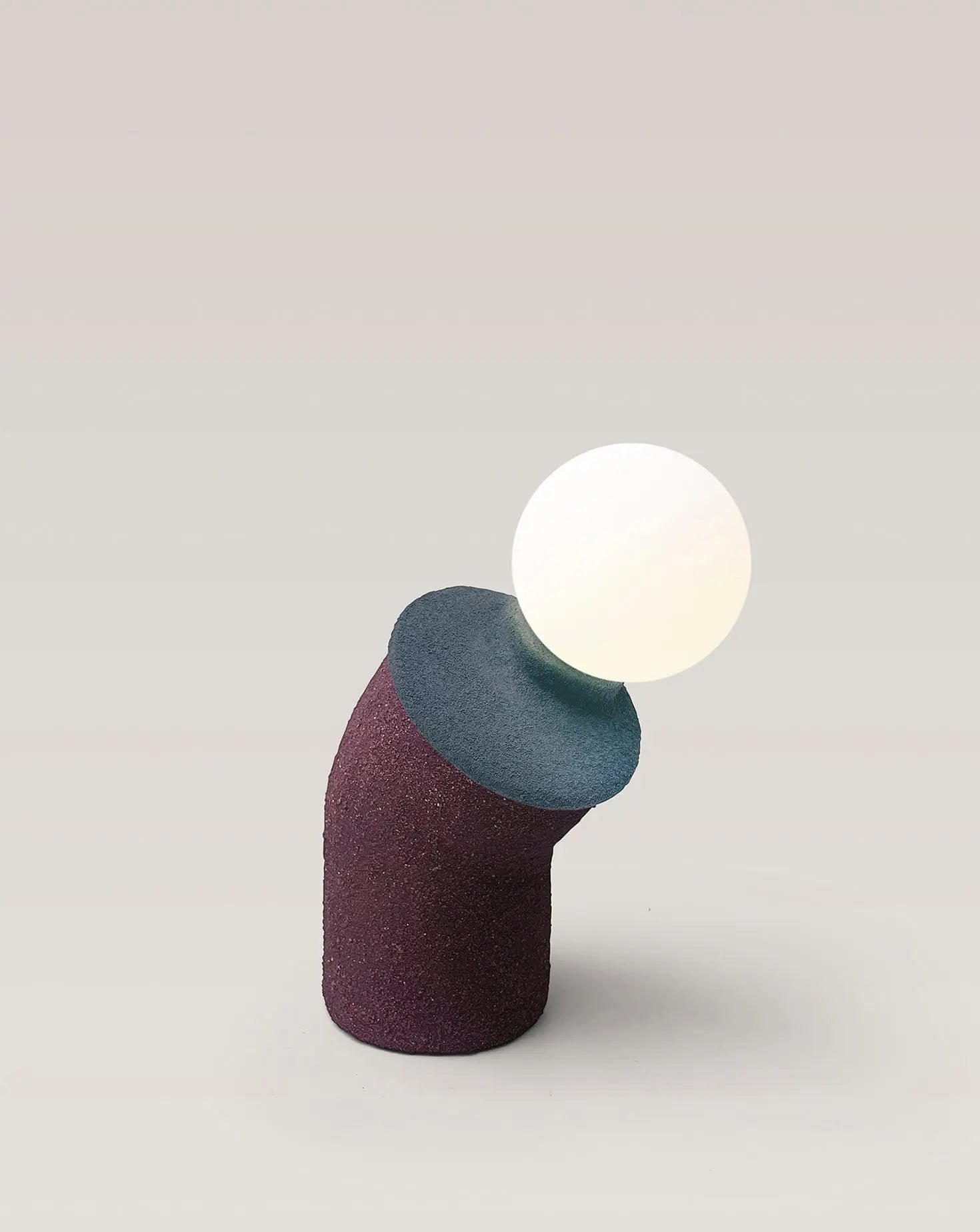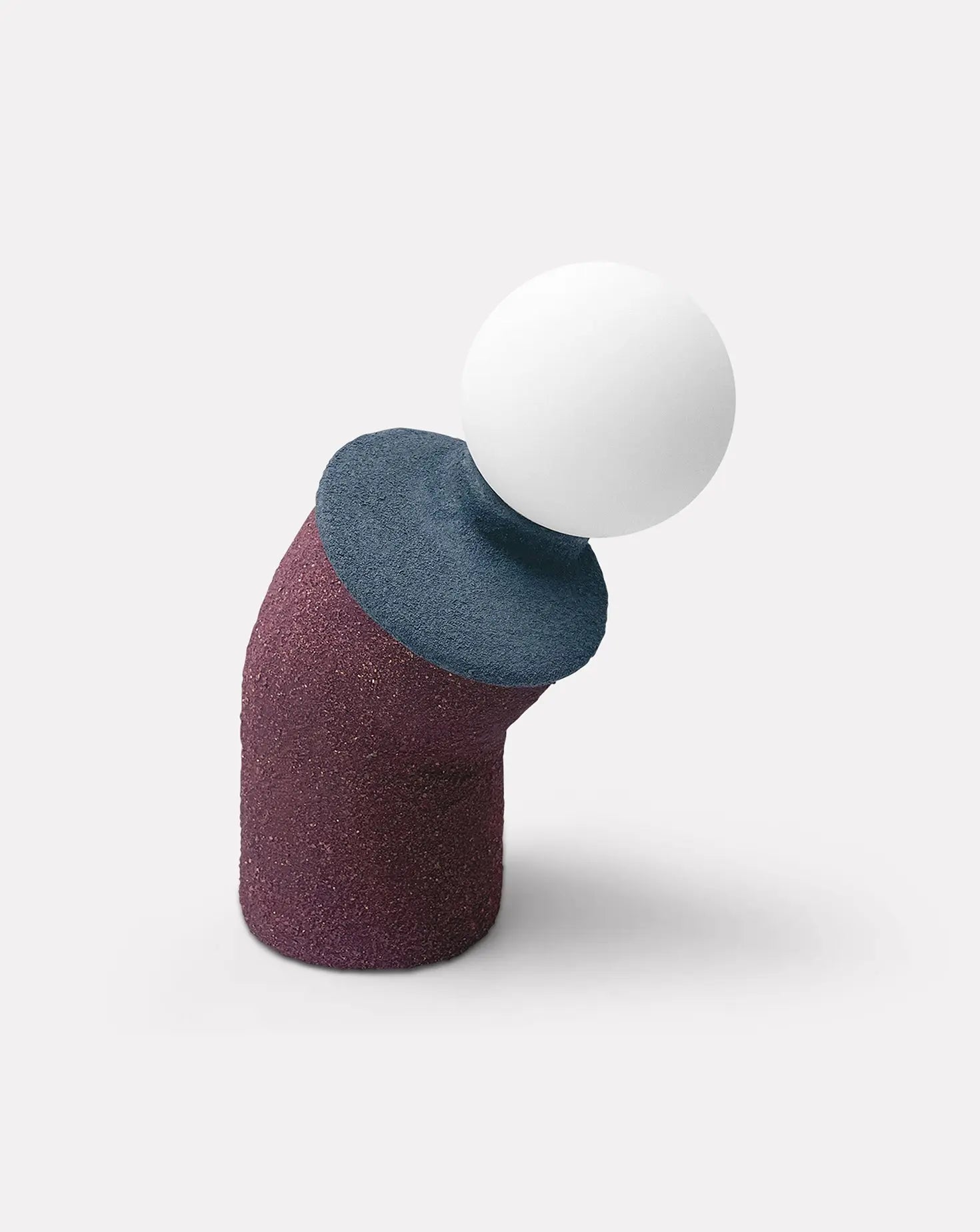 The Thinker table lamp is handmade by London-based lighting designer Nicola Cecutti from mixed media including clay, reclaimed plastic, PVA, sand, acrylic paint, pigment, polyurethane. A single dimmable LED bulb within a white glass globe rests atop its cyclindrical base, which has a bent form and textured surface.