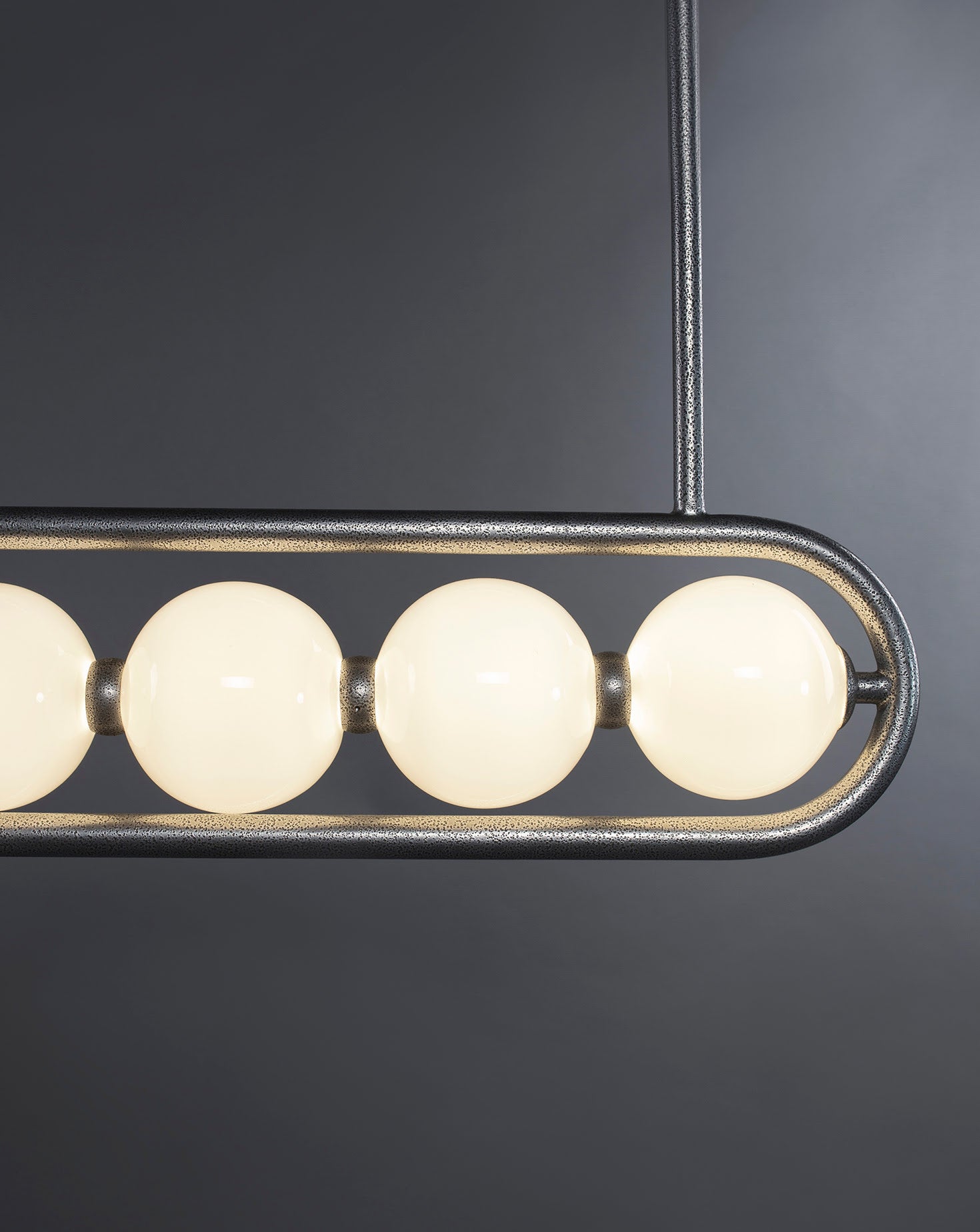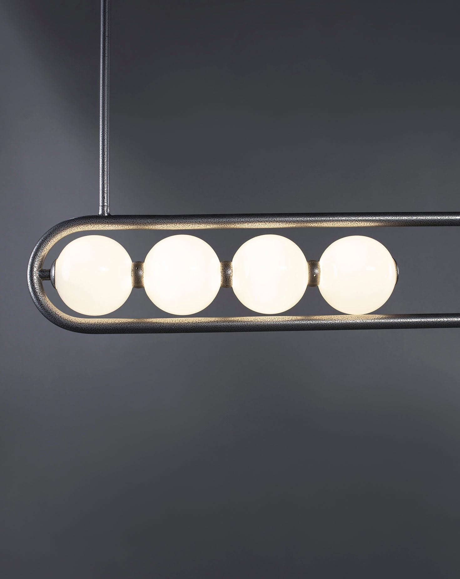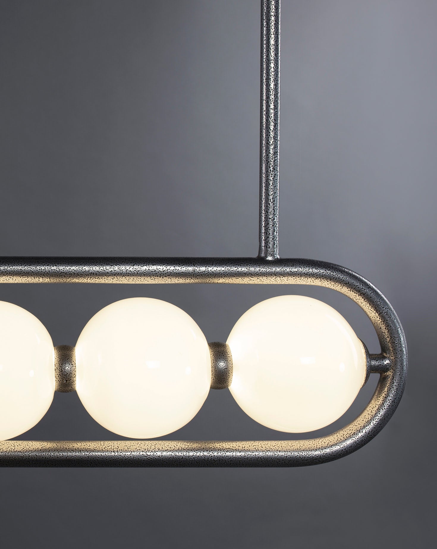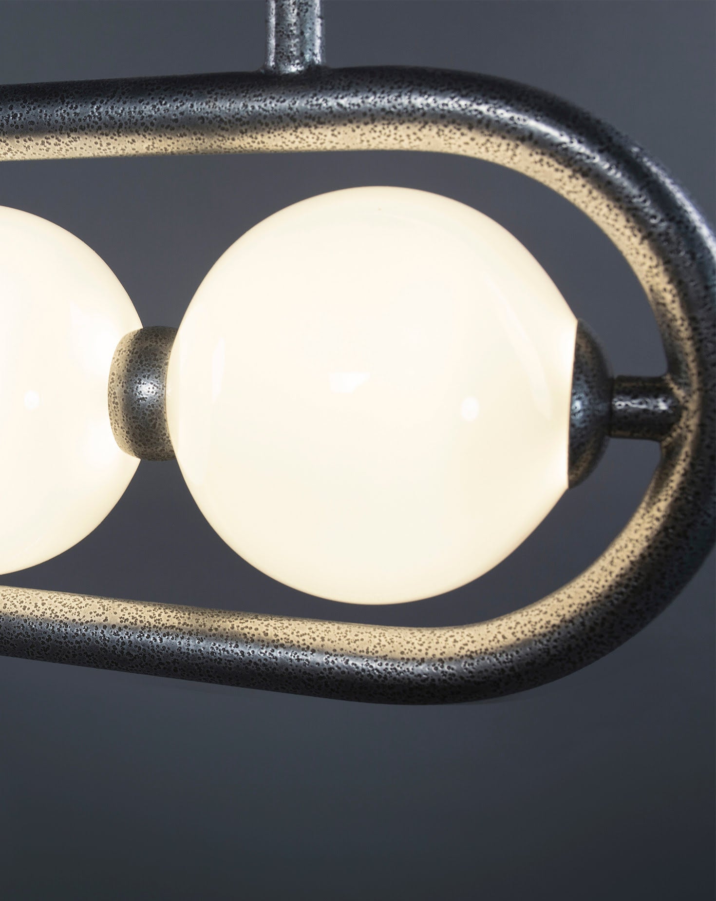 The Twin Steel Light Tall features two parallel steel loops connected at the edges, suspended by sleek rods for a clean, balanced design. Glass globes are seamlessly set within the loops, creating a contemporary, symmetrical form that adds understated elegance to any space.
