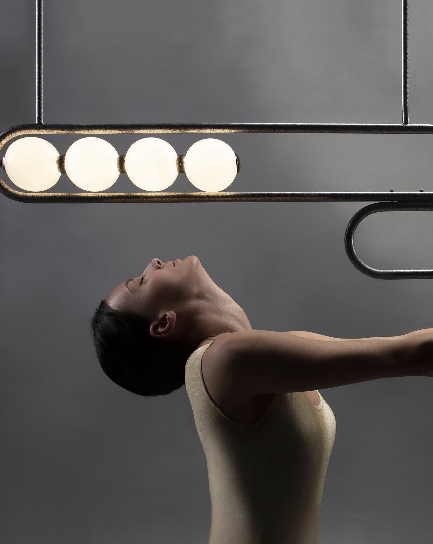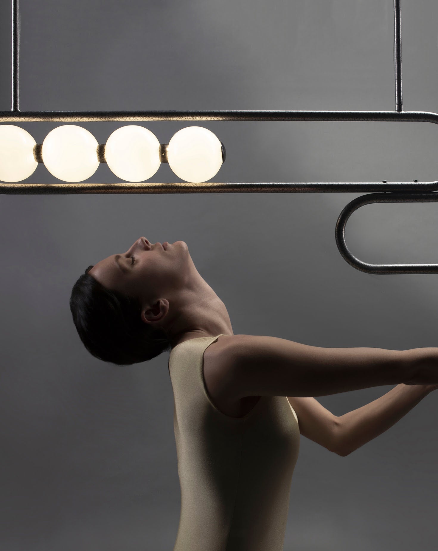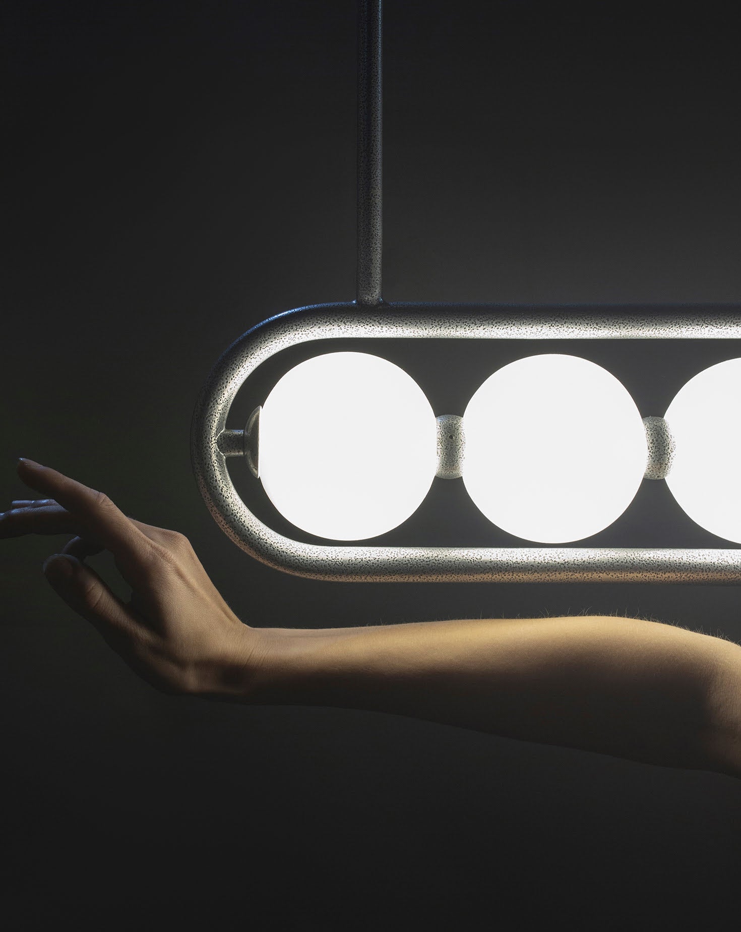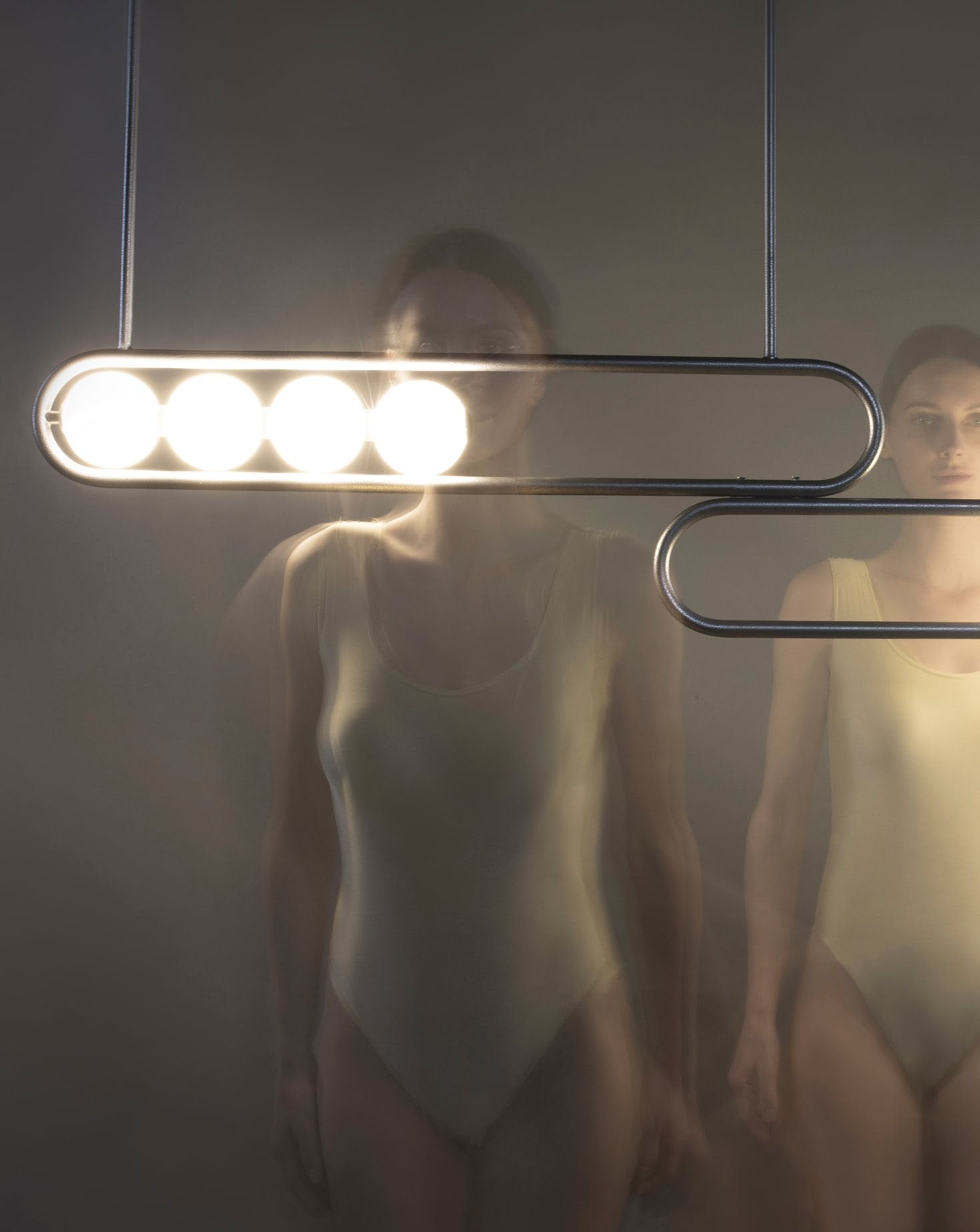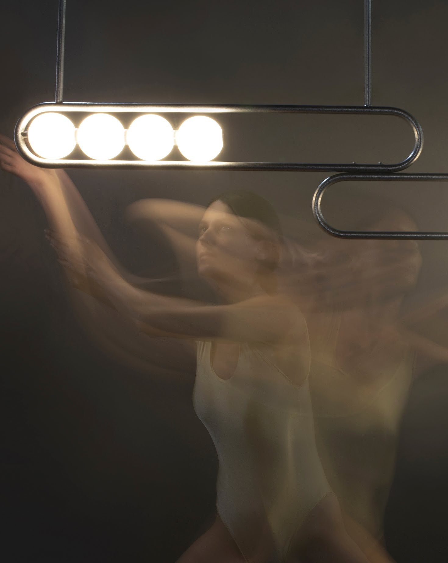 The Twin Steel Light Tall features two parallel steel loops connected at the edges, suspended by sleek rods for a clean, balanced design. Glass globes are seamlessly set within the loops, creating a contemporary, symmetrical form that adds understated elegance to any space.