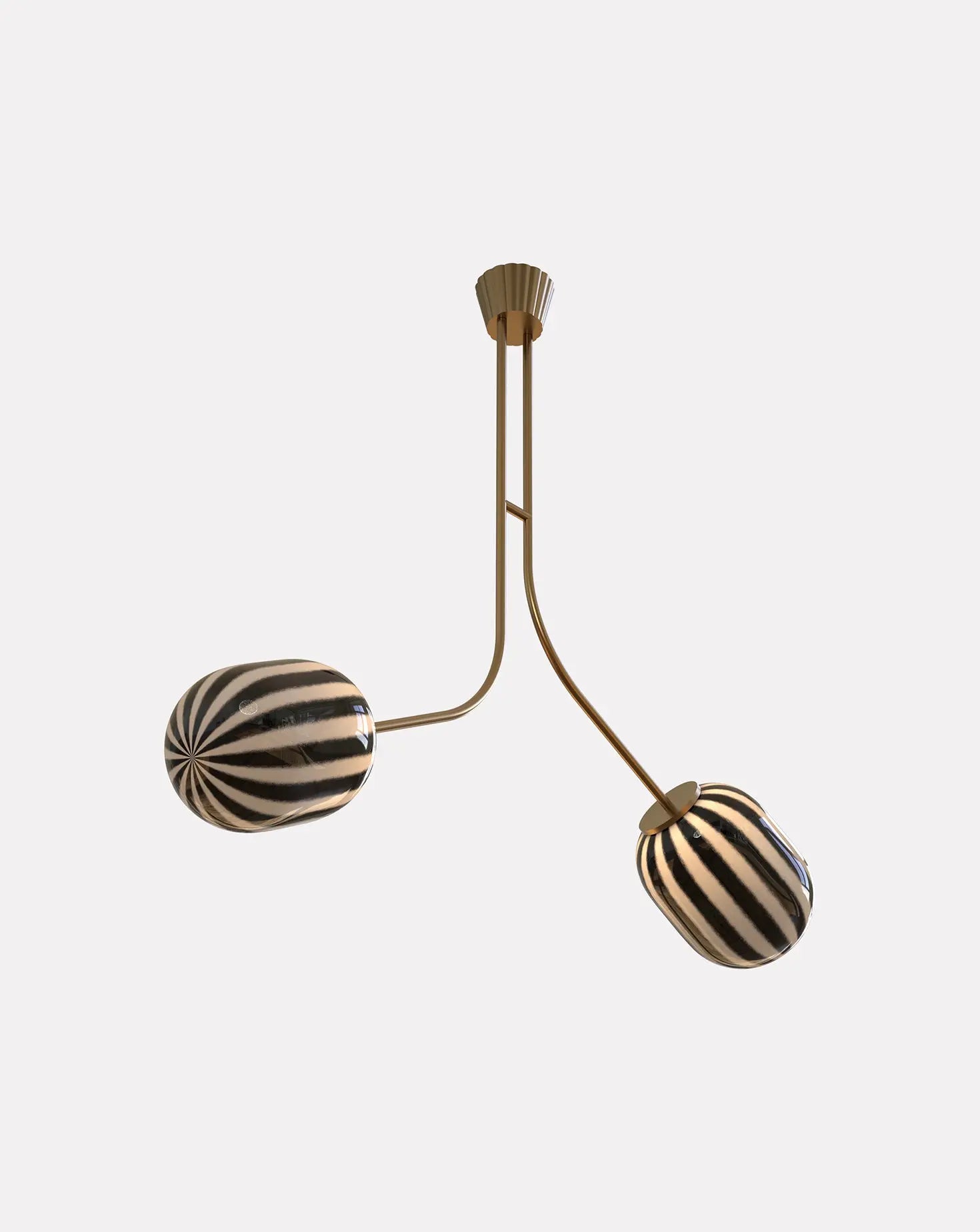 Part of the Sugar collection, the two-module Candy chandelier is a sentimental piece that references nostalgic memories of traditional Indian hard-boiled sweets. Each one is hand-blown by skilled Indian glassblowers, with a striped, rounded design, subtle ombre effect and lustrous brass frame to draw the eye in.