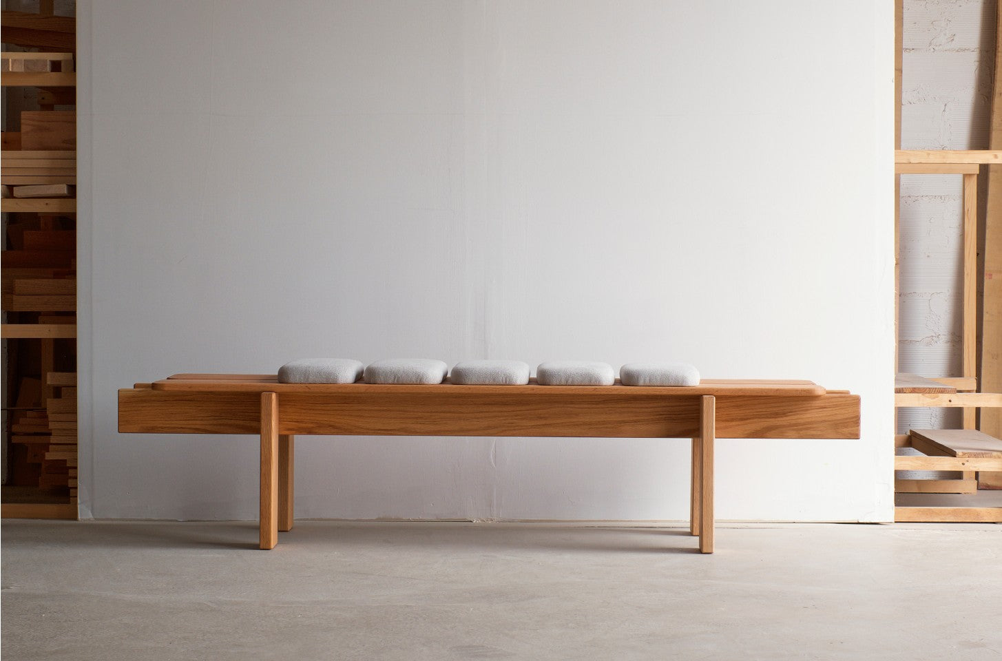 Ueno Oak Bench is a contemporary seating piece inspired by the quiet balance of Tokyo's Ueno neighborhood - where tradition and modernity meet. Crafted from solid oak with a natural lacquered finish, its clean lines reflect Japanese architectural restraint. Soft, block-like cushions upholstered in sustainable polyester pearl gray tone fabric provide contrast and comfort, making it a versatile piece with cultural resonance.